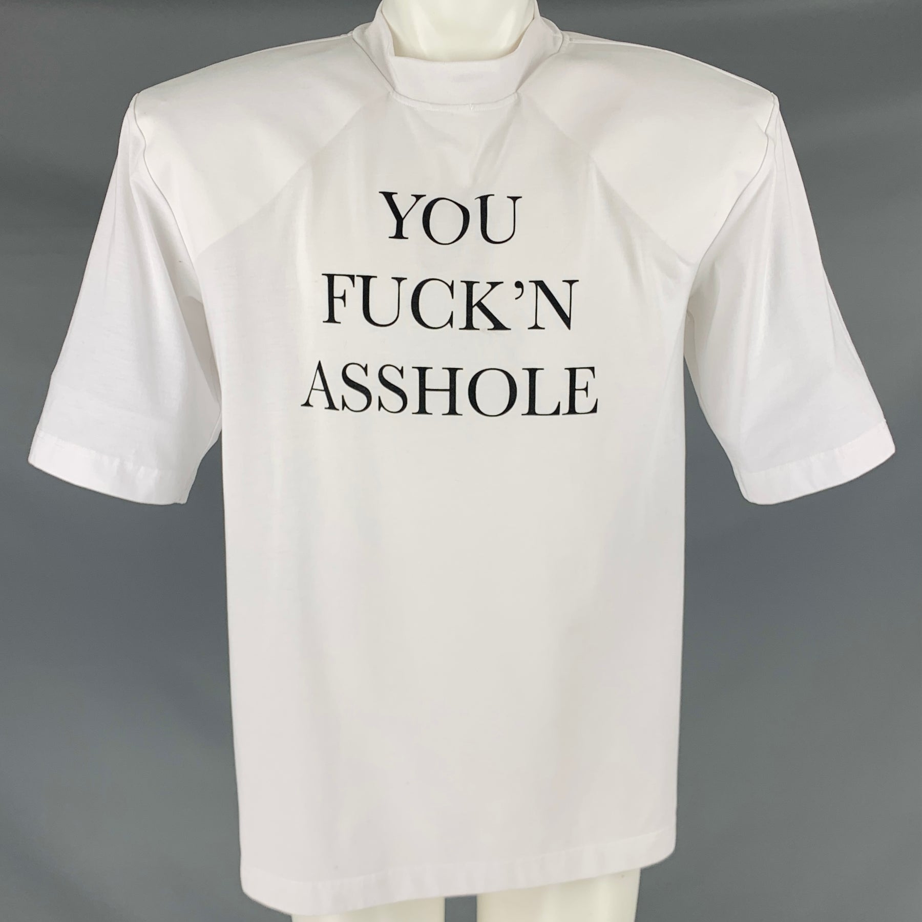 VETEMENTS POUR FEMME FW2017 "You F*ck'n Assh*le" t-shirt in a white polyester knit featuring black text print, crew neck, and dramatic removable shoulder pads. Made in Portugal.