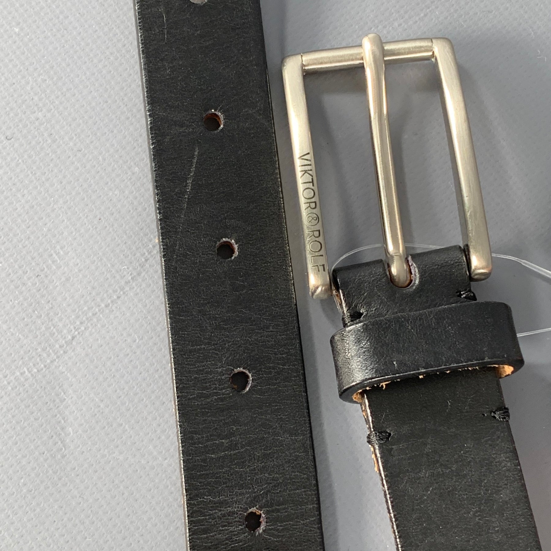 VIKTOR & ROLF belt in a black leather featuring a silver tone metal rectangle design, and silver tone metal buckle closure.