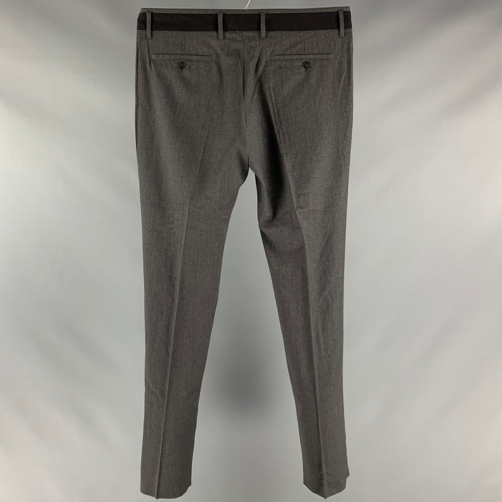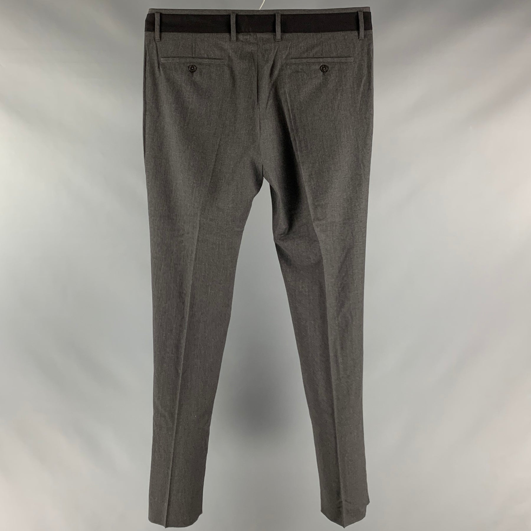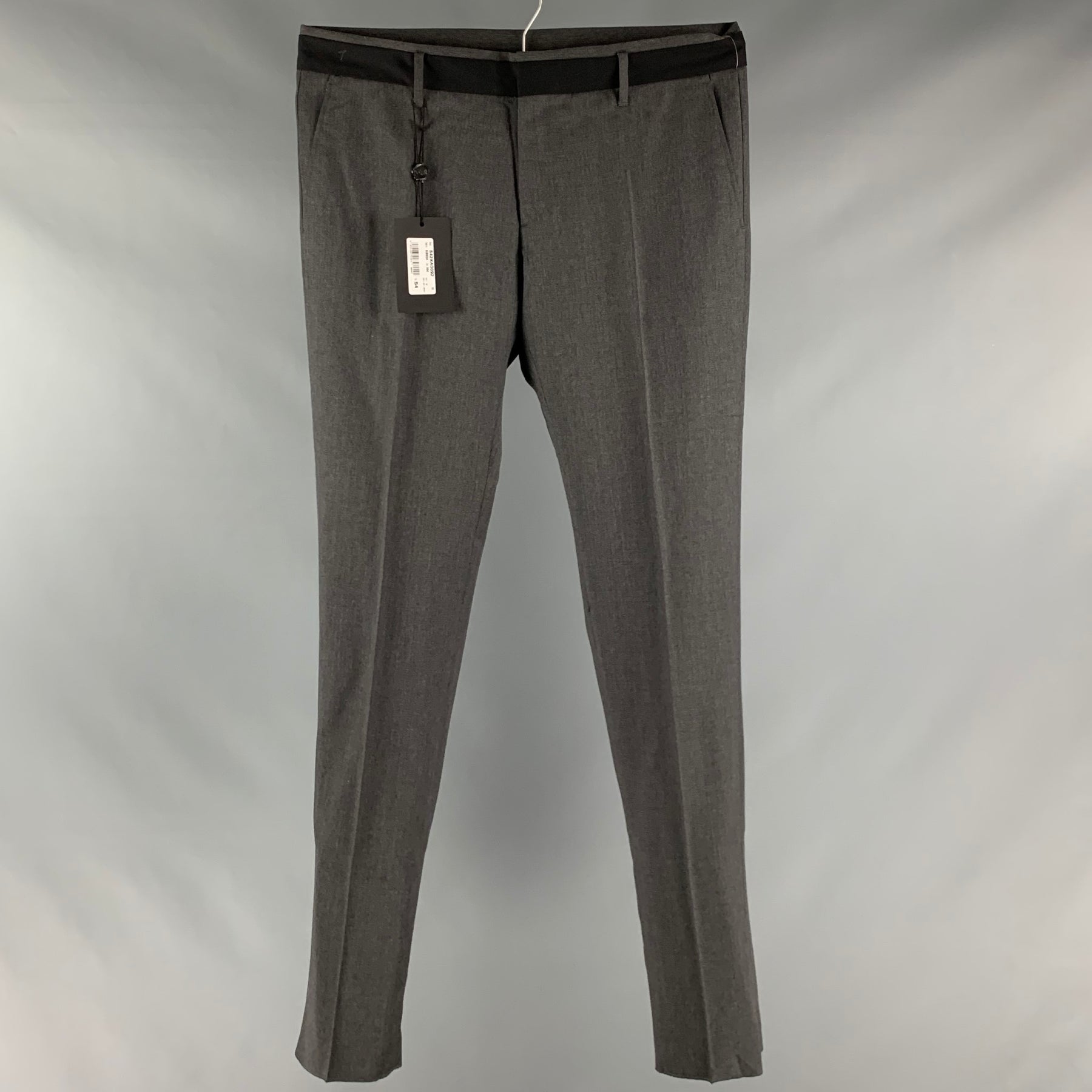 VIKTOR & ROLF tuxedo dress pants comes in a dark gray & black wool featuring a flat front, slim fit, front tab, and a zip fly closure. Made in Italy.