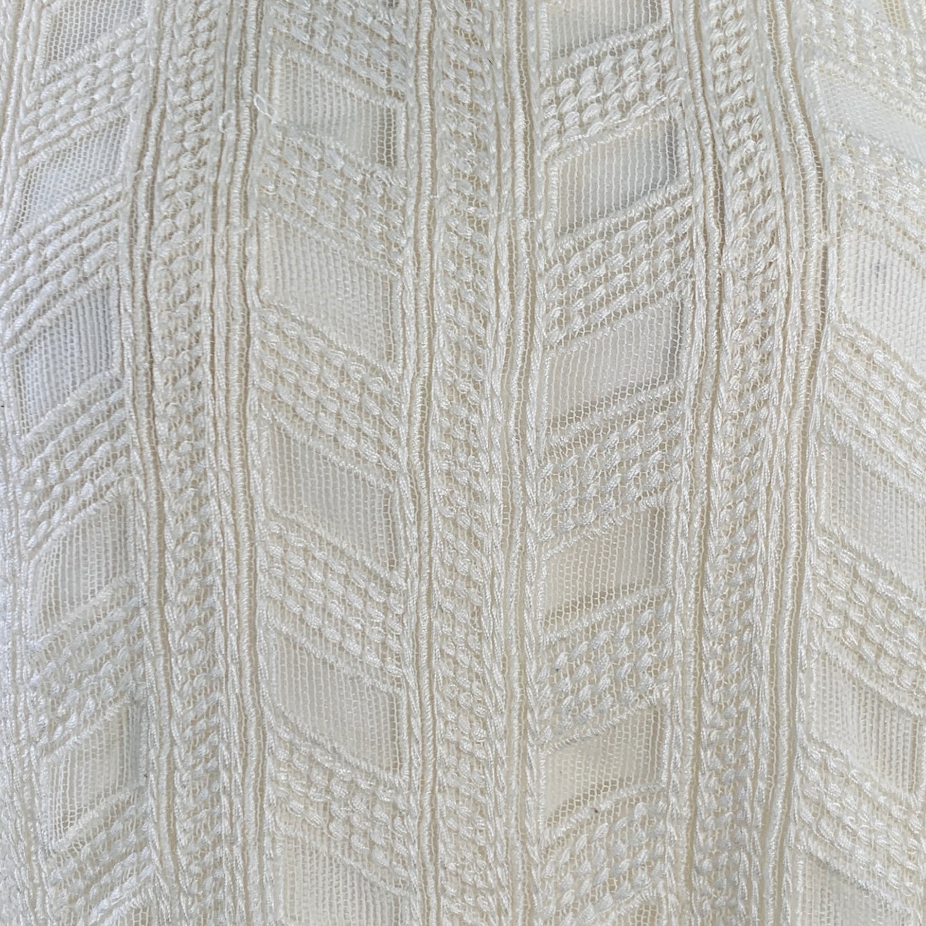 VINCE casual top in a cream nylon featuring an embroidered geometric pattern, sleeveless design with raw edges, and round neck.