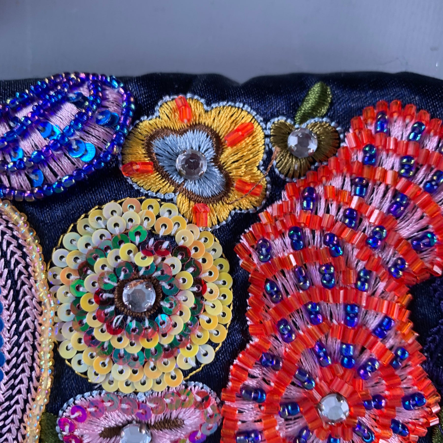 VINTAGE clutch handbag in a blue polyester satin featuring featuring an all over embroidered and beaded abstract floral design, beaded shoulder strap, and kiss lock closure.