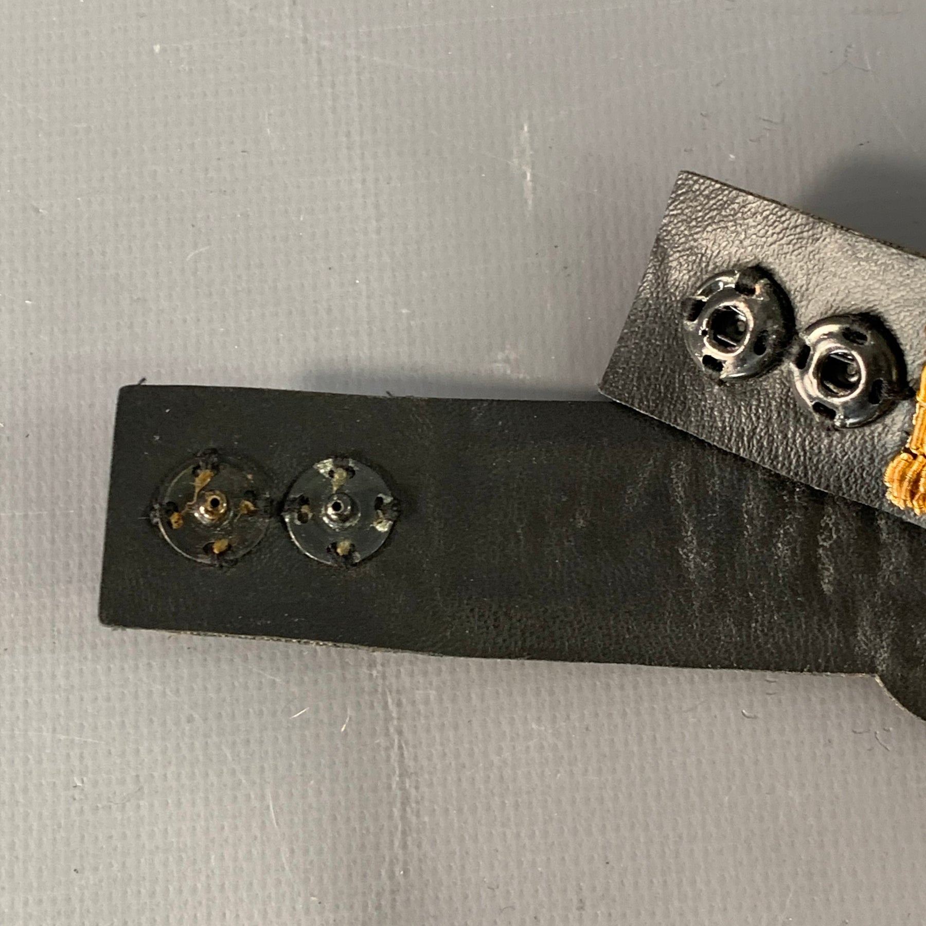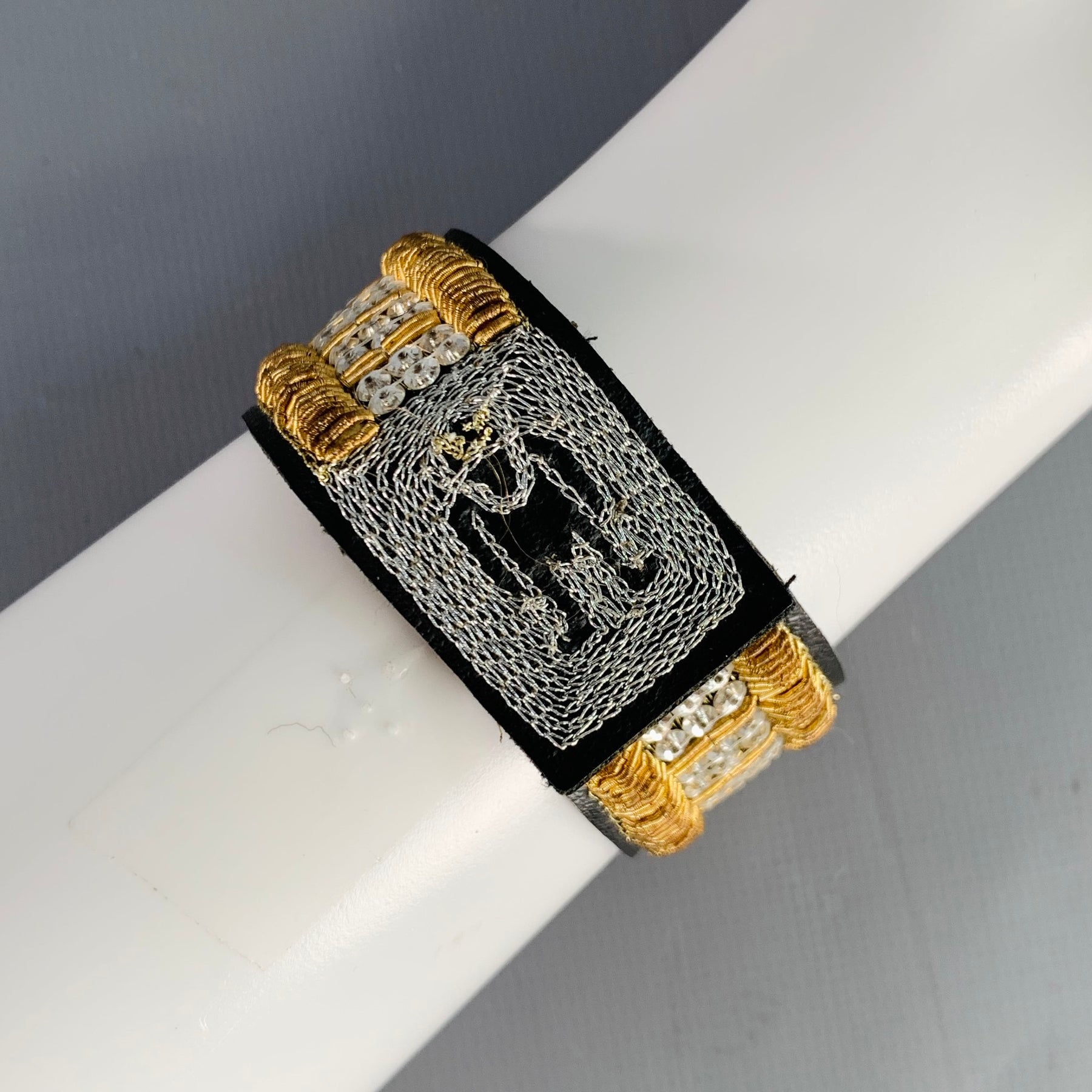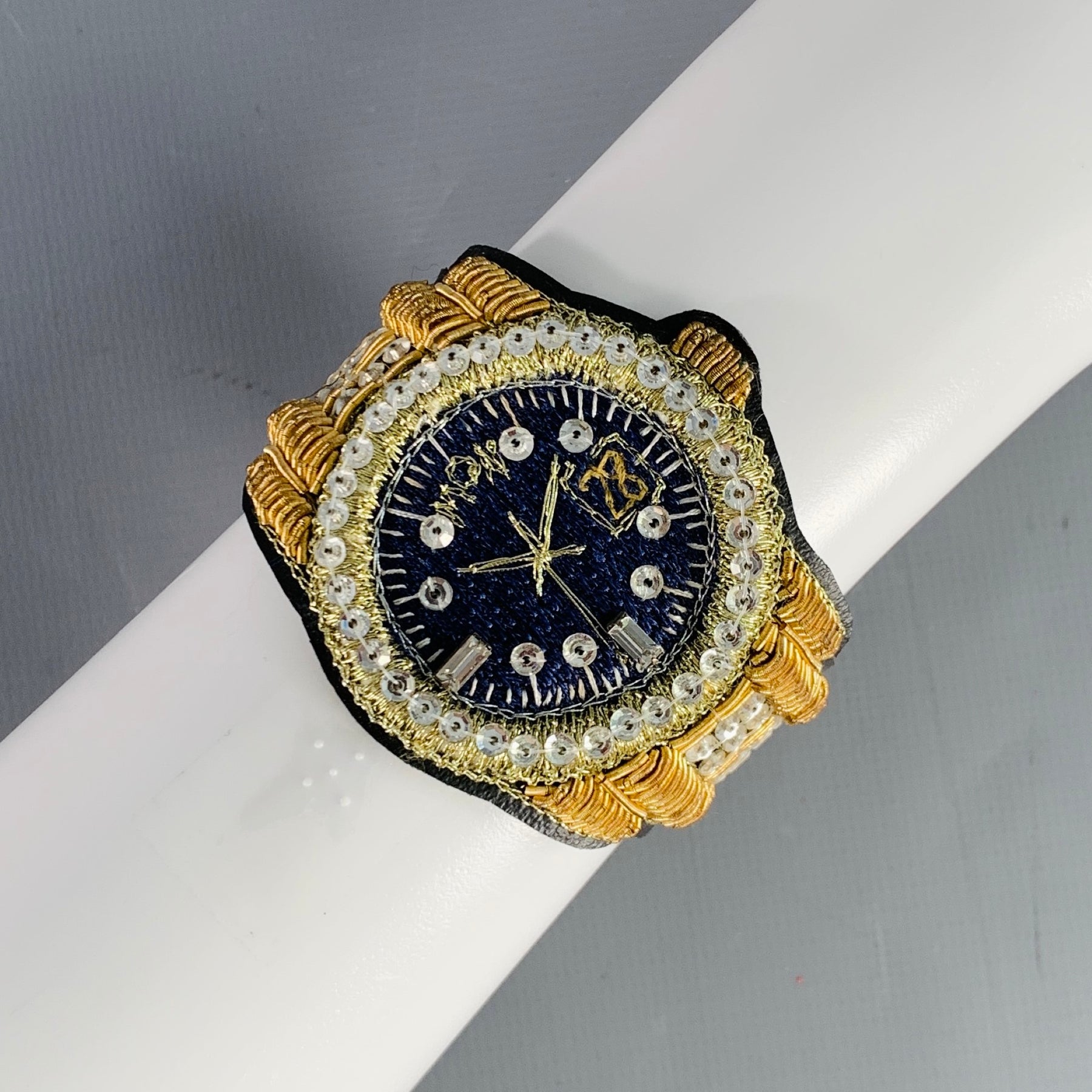 WALTER VAN BEIRENDONCK bracelet in a gold tone polyester and black faux leather featuring a watch style with embroidered details and blue watch face, and snap closure.