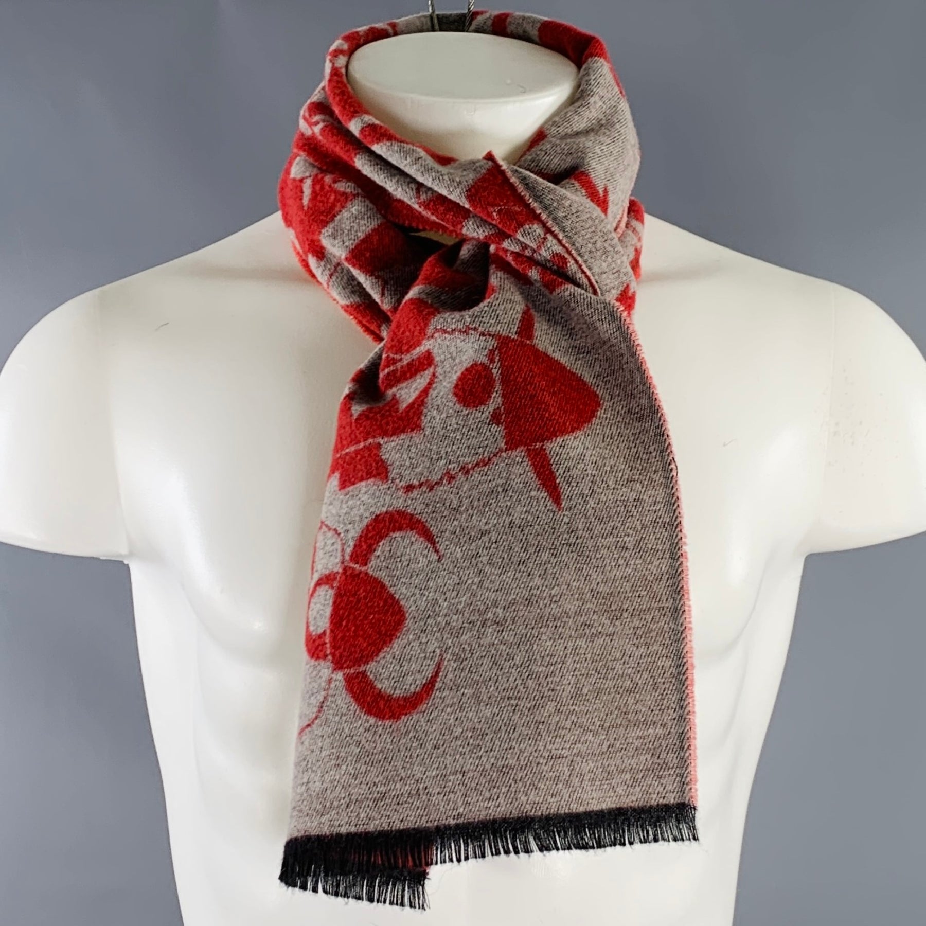 WALTER VAN BEIRENDONCK scarf in a red and tan knit featuring cartoon character print, and black fringe details.
