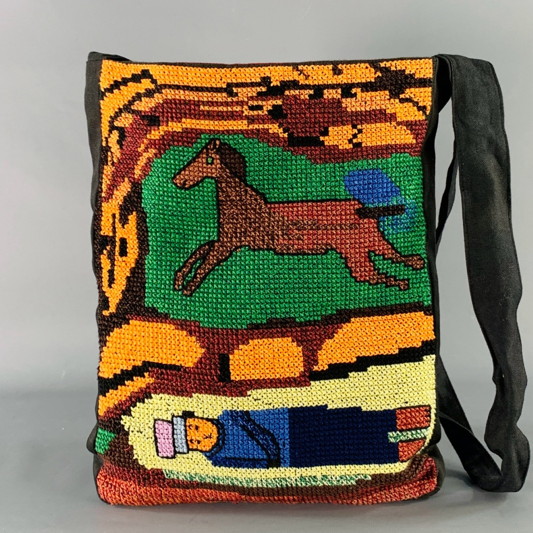 WALTER VAN BEIRENDONCK SS14 "Budapest" bag in a black cotton featuring a vibrant multicolor embroidered horse design, top handles, and single compartment with small zip pocket.