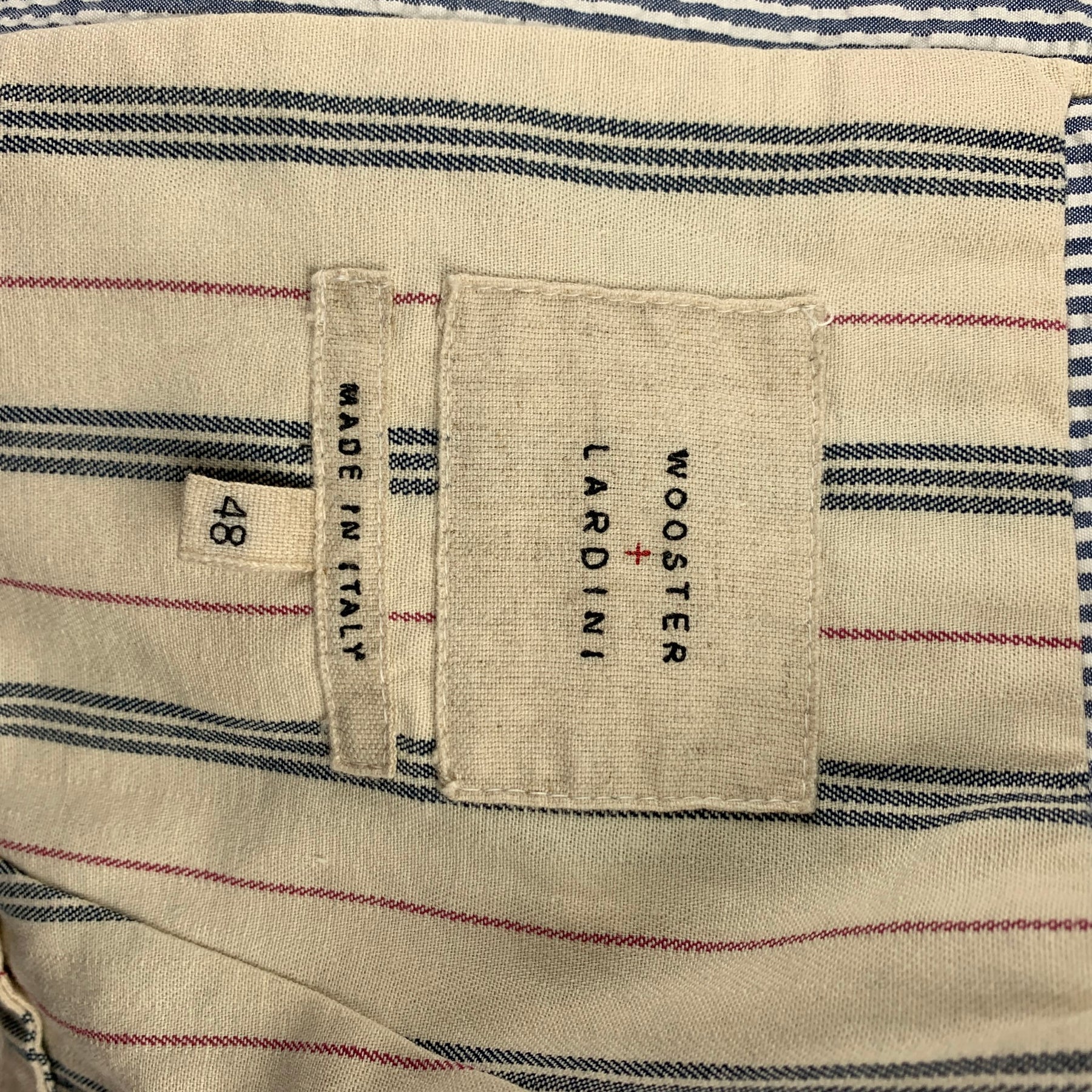 WOOSTER + LARDINI suit comes in blue & white seersucker cotton with a half liner and includes a single breasted, buttoned sport coat with peak lapel and matching cropped front trousers. Made in Italy.