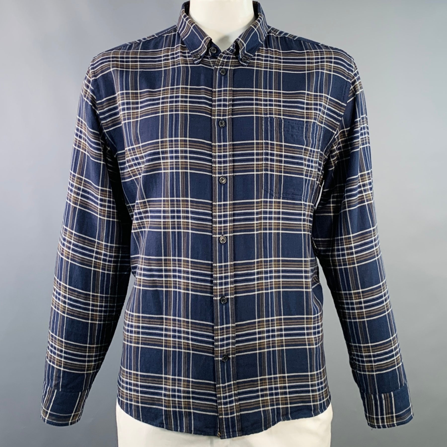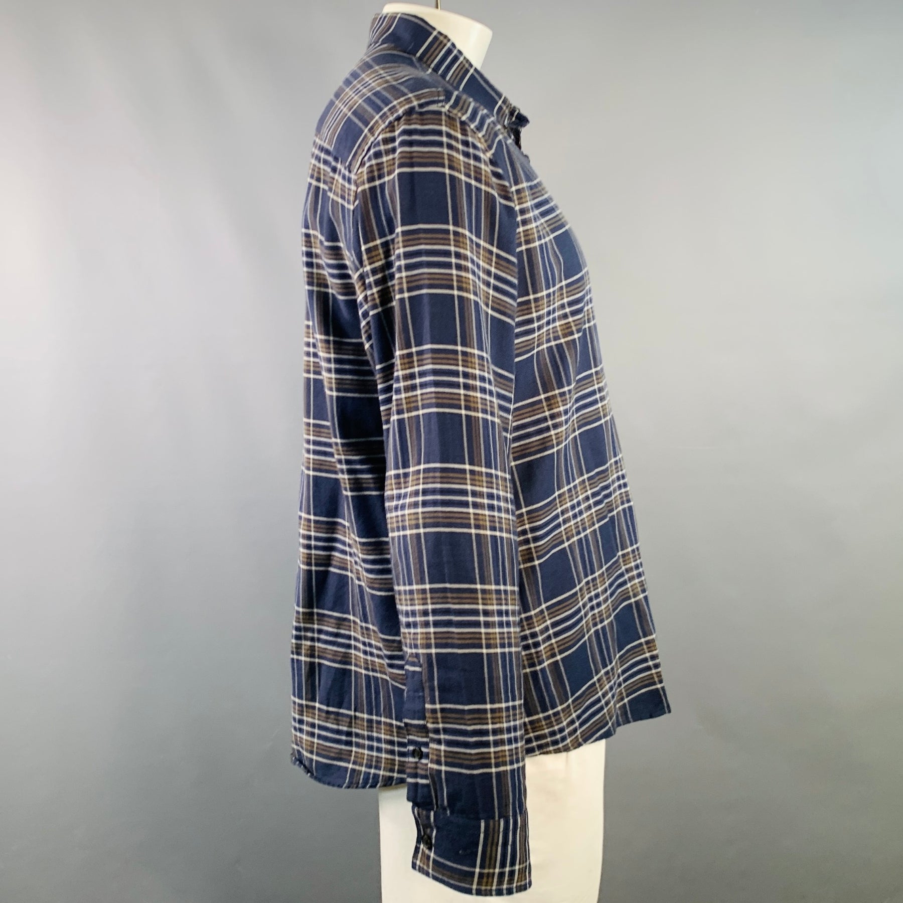 BILLY REID Size XL Navy Grey Plaid Cotton One Pocket Long Sleeve Shirt