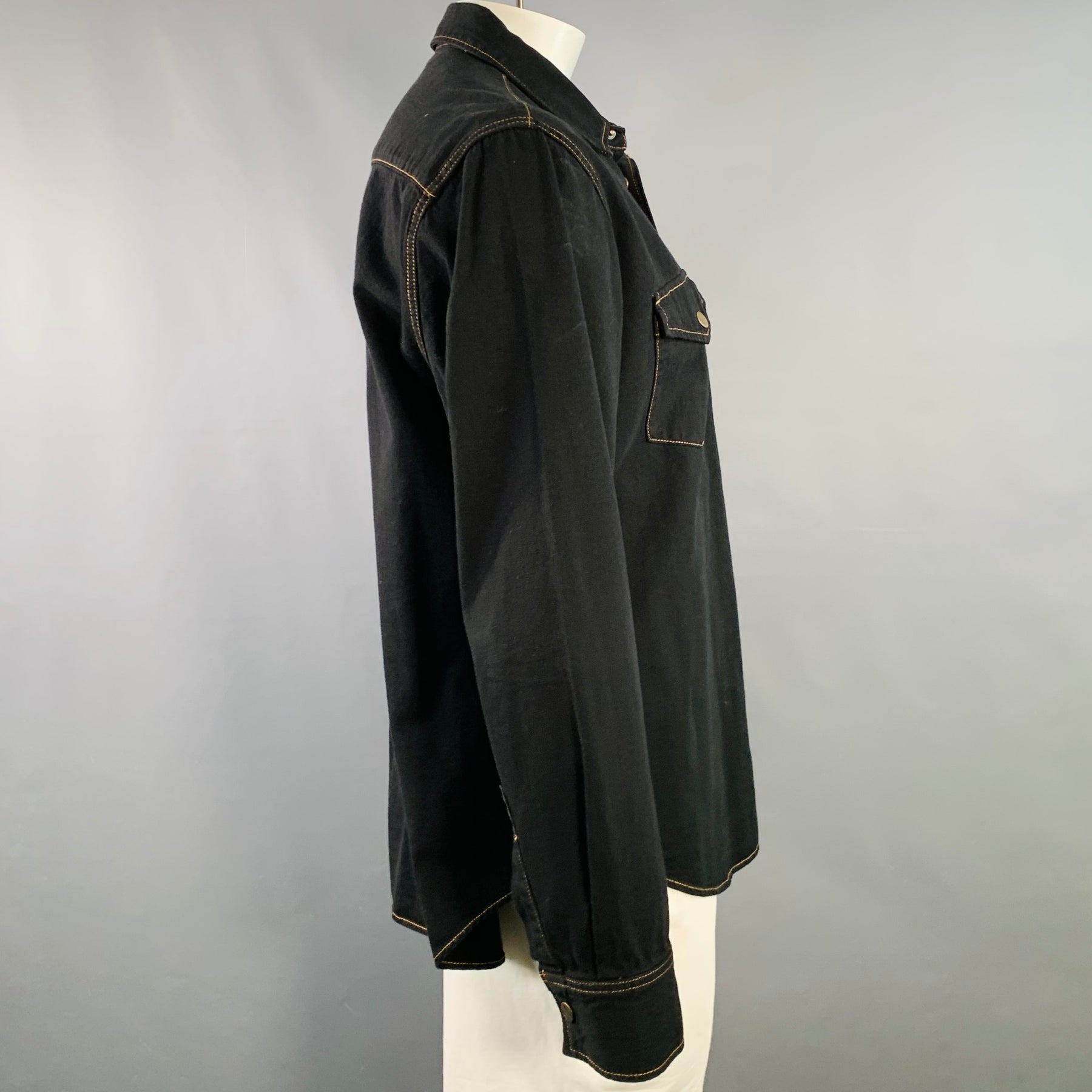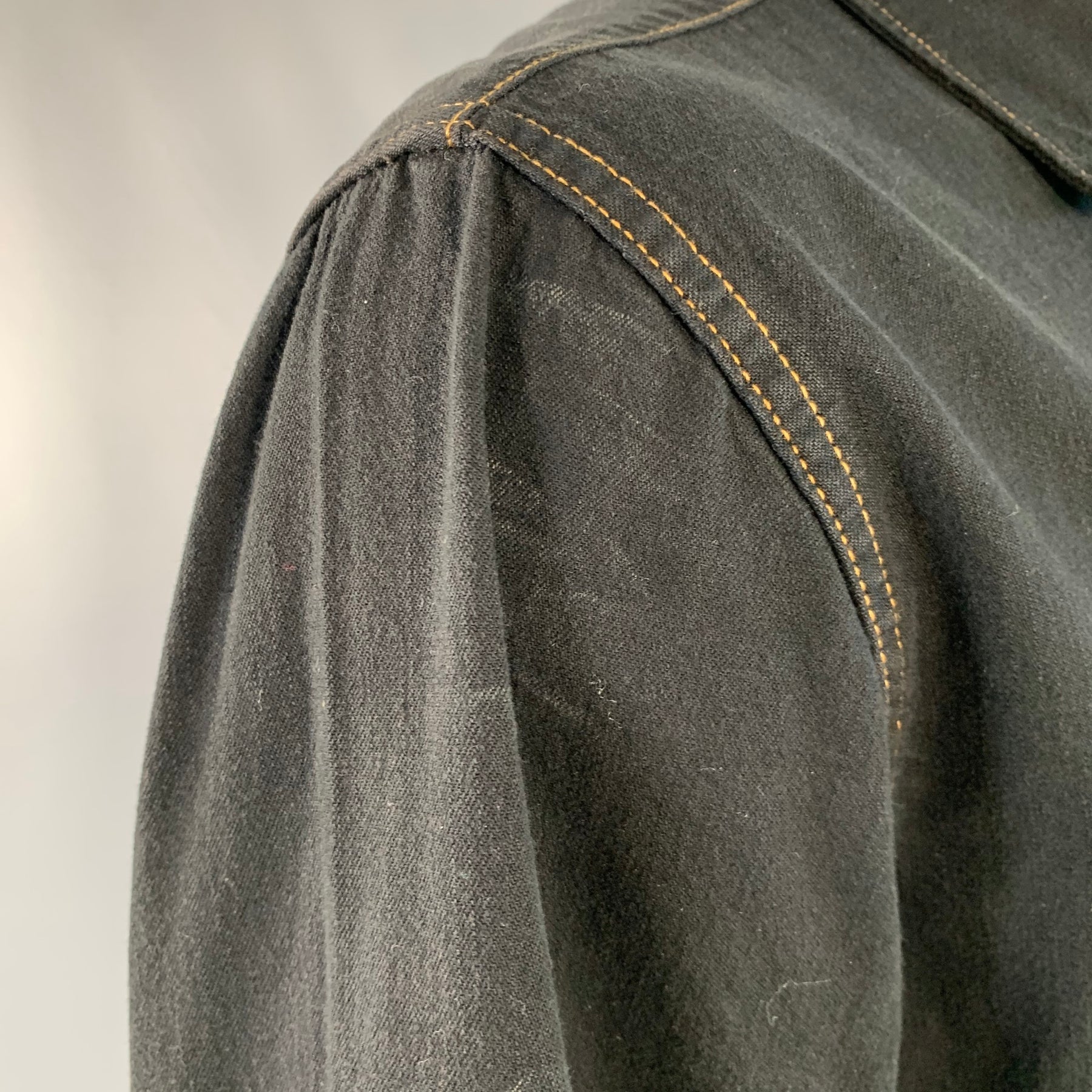 BILLY REID "Shoals" long sleeve shirt in a black cotton woven fabric with yellow contrast stitching, two flap pockets, and snap closure.