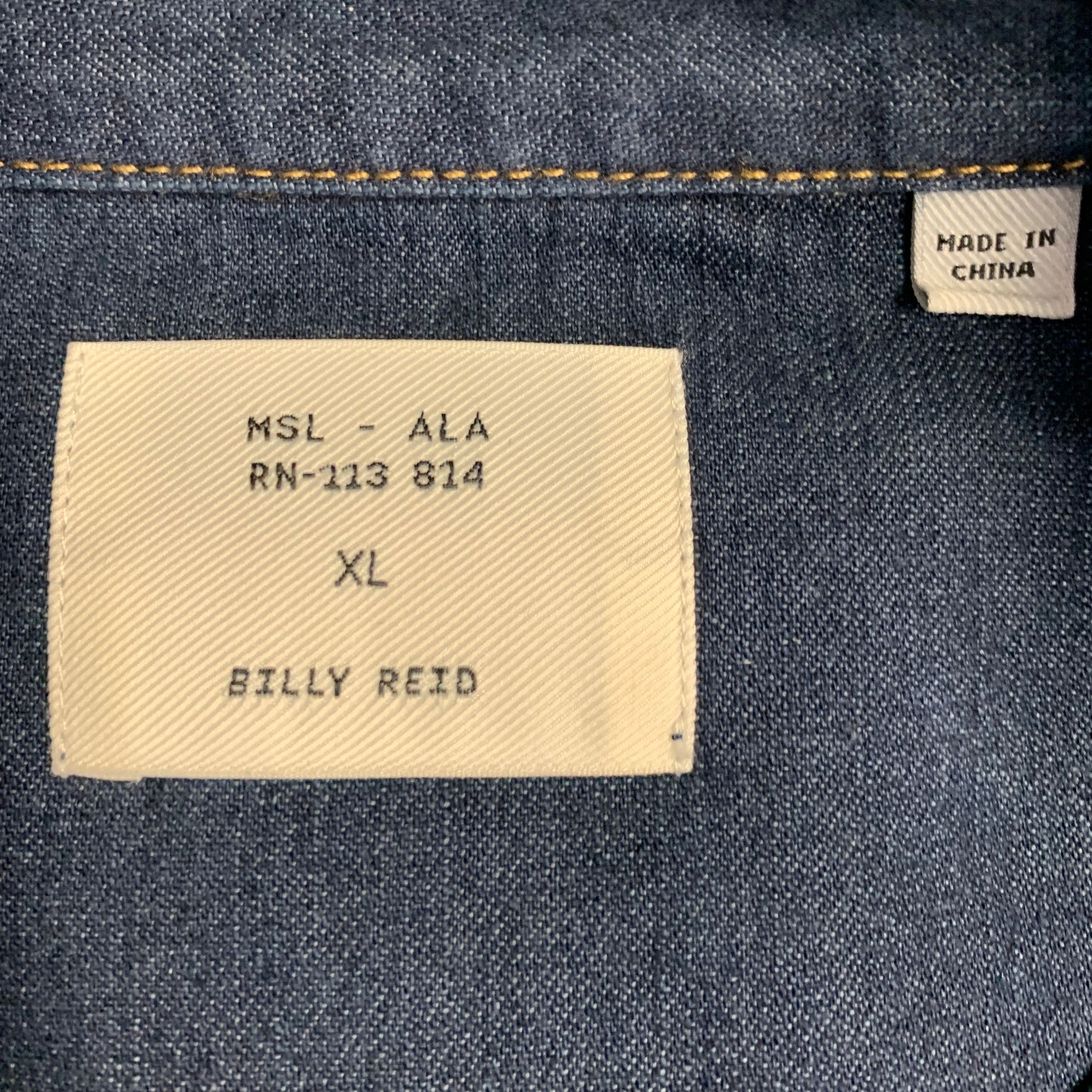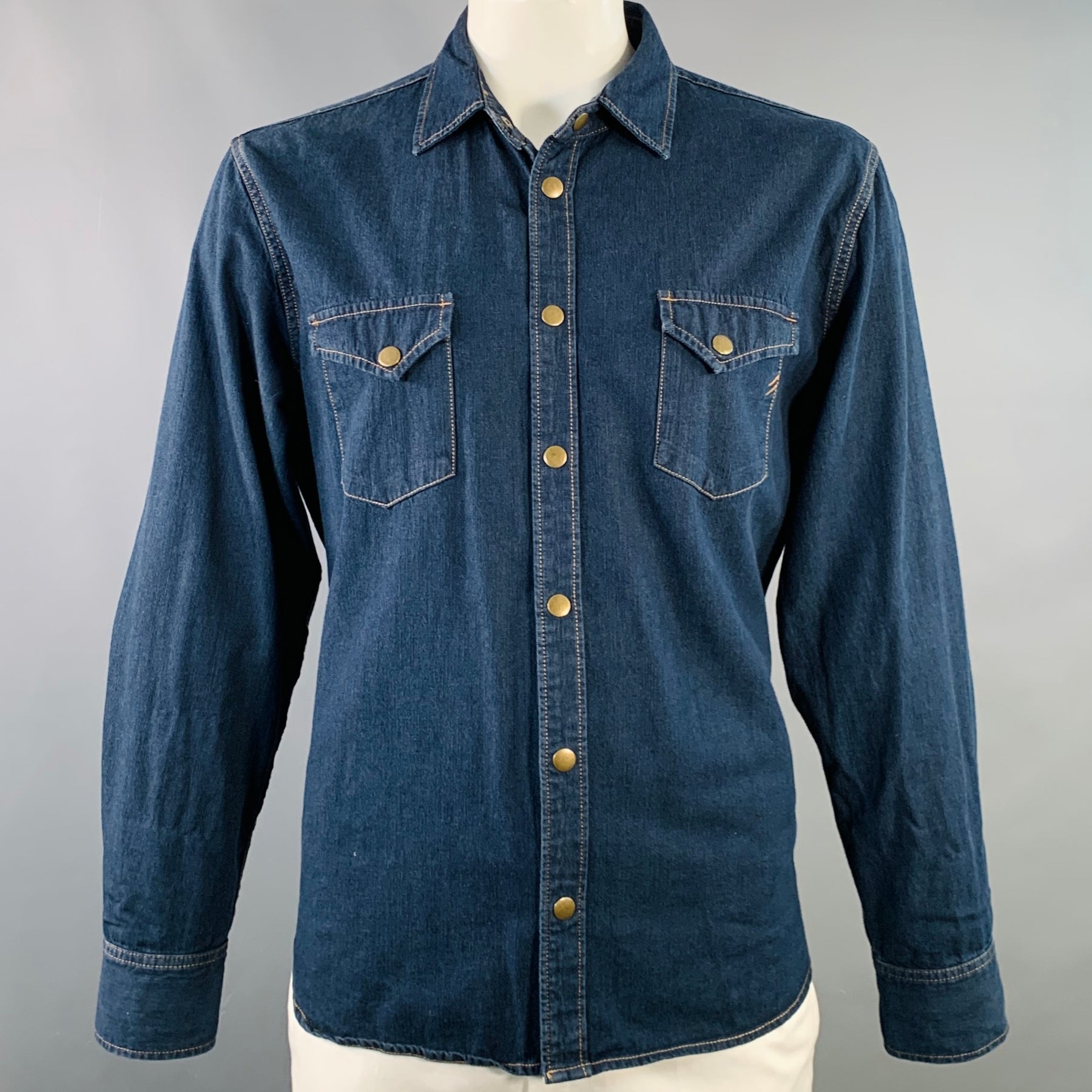 BILLY REID Size XL Shoals Blue Indigo Contrast Stitch Cotton Snaps Long Sleeve Shirt