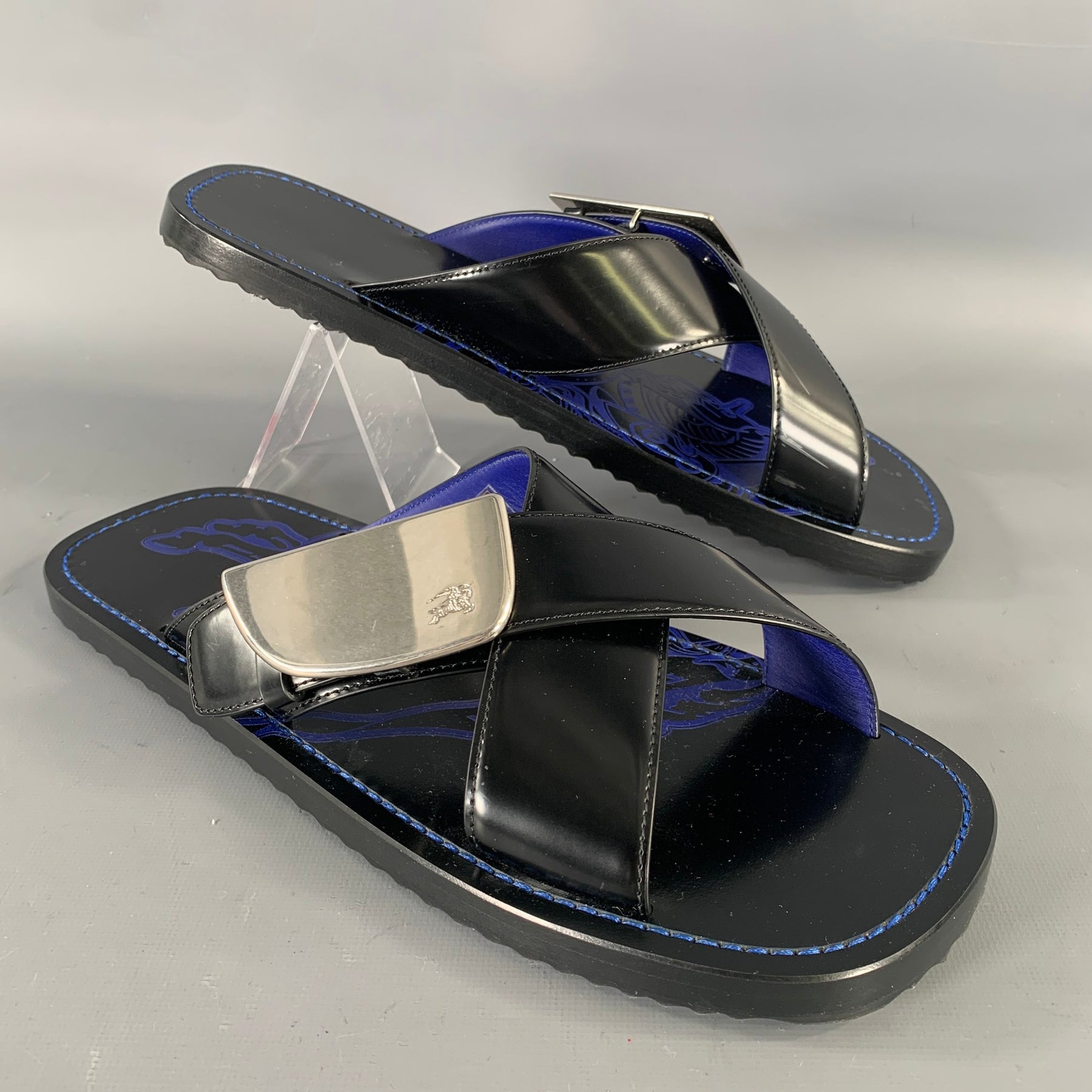 BURBERRY Size 10 Black Blue Leather Slide Sandals