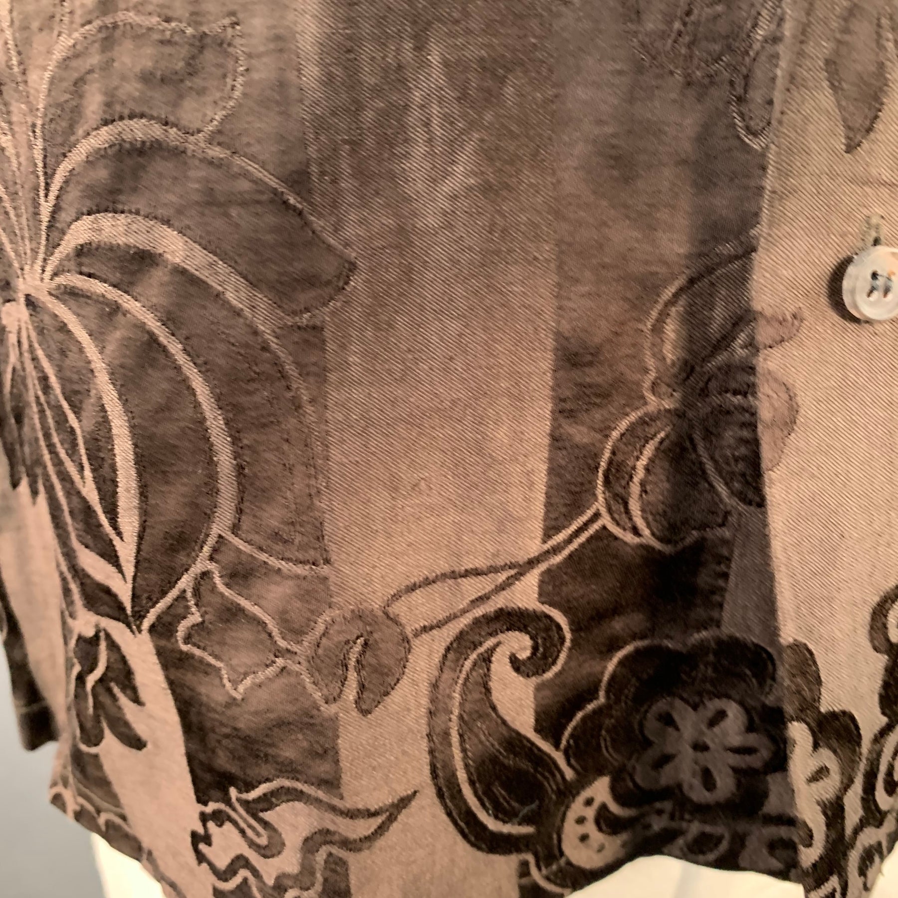 HAIDER ACKERMANN long sleeve shirt in a brown linen silk jacquard featuring a floral stripe pattern, one pocket, and button closure.