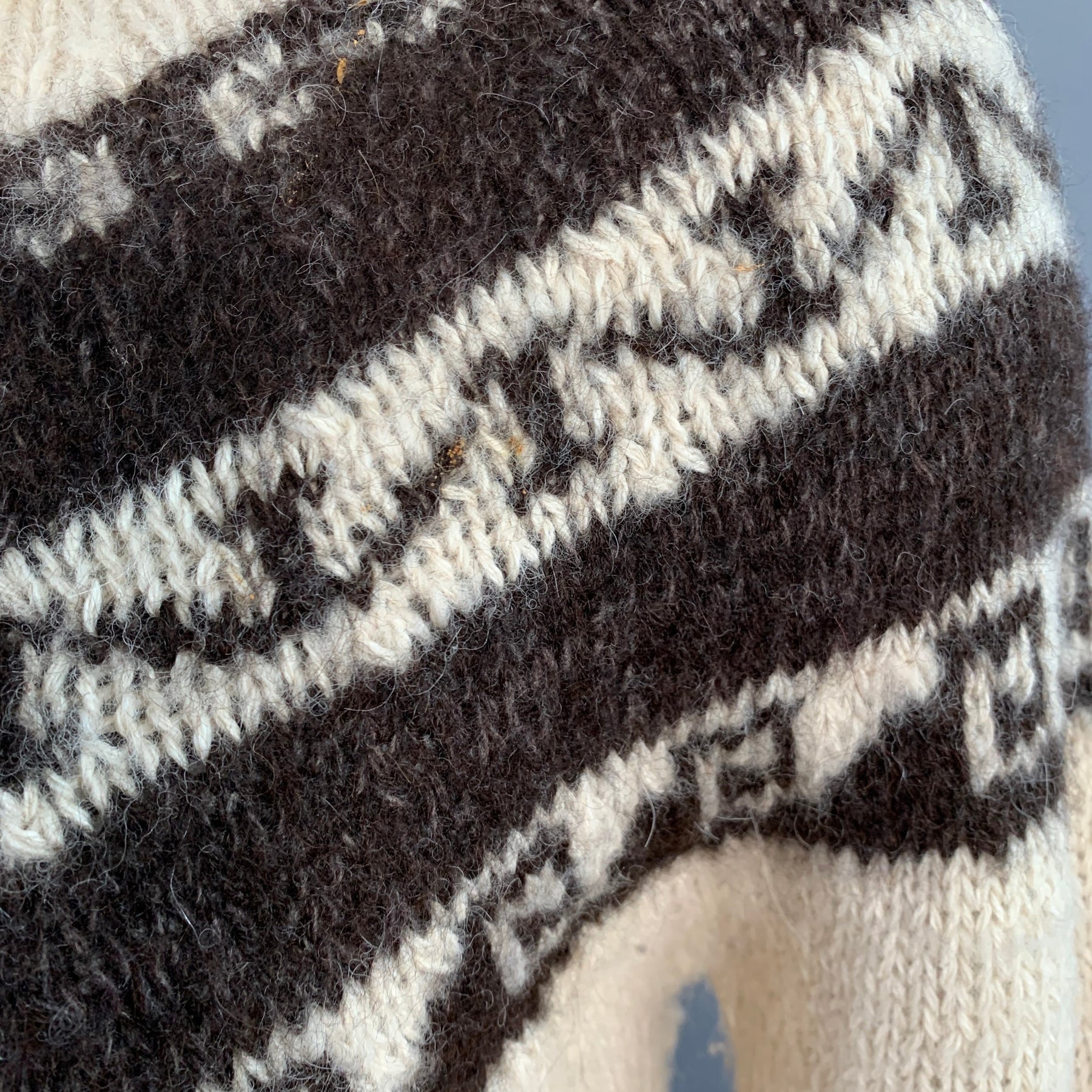 JUNYA WATANABE cardigan in a cream and brown wool knit featuring a hooded style, geometric pattern, and zip up closure.