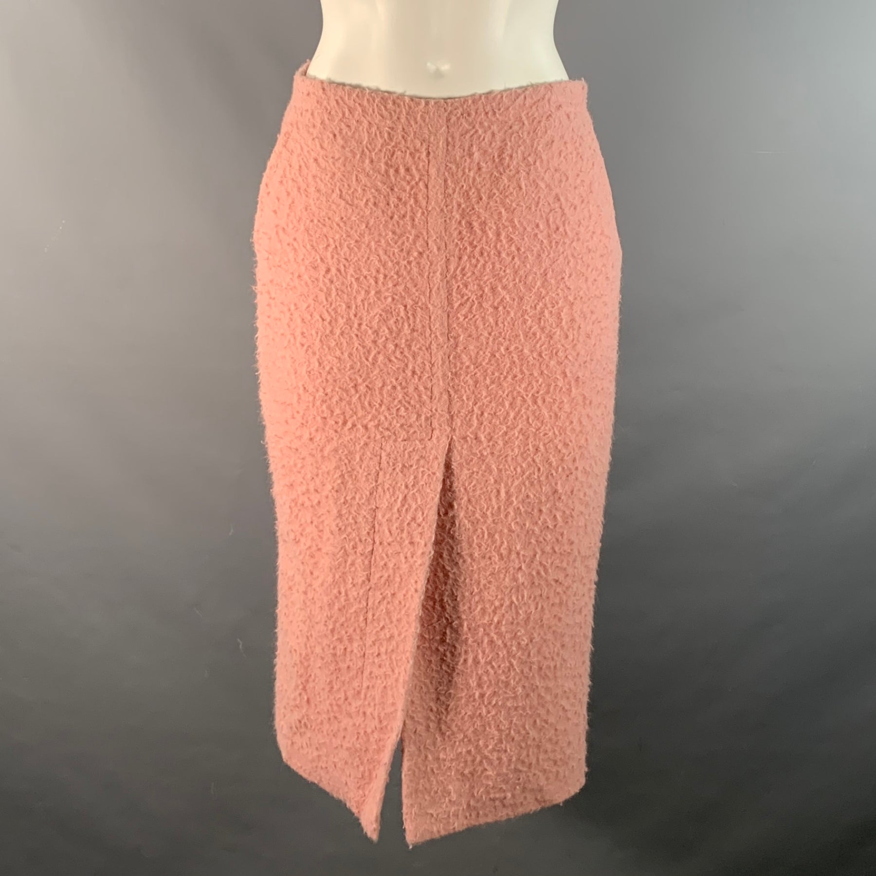 MARNI skirt is a striking example of refined Italian craftsmanship and tactile design. Expertly made in Italy from a luxurious alpaca blend, the garment features a beautiful soft pink color and a distinct textured finish that adds depth to the silhouette. Tailored for an adult female in a size 4, this mid-calf length pencil skirt is elevated by sophisticated details, including brushed wool and a modern front slit.