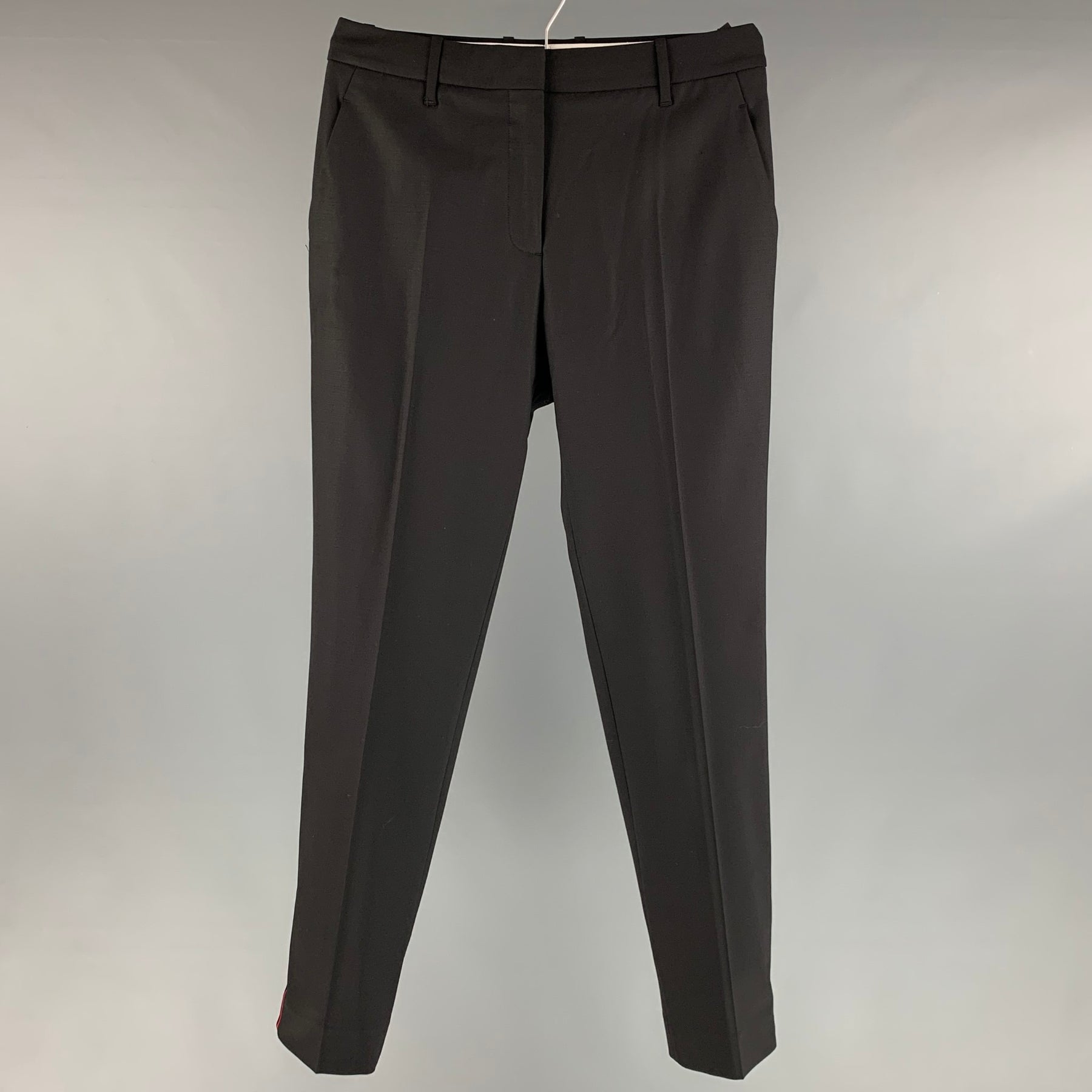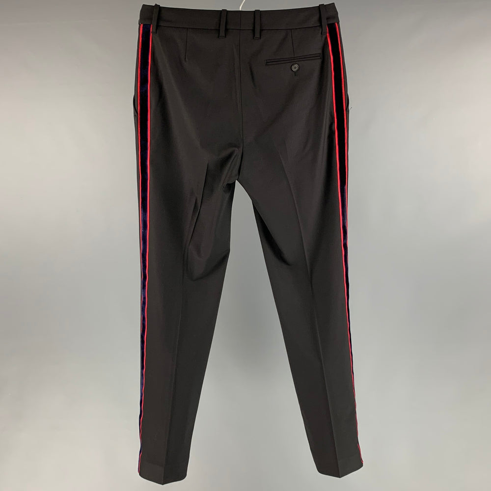 Los pantalones de vestir CALVIN KLEIN 205W39NYC vienen en un material tejido de lana y elastano de color negro con cintura media, detalle de ribete de terciopelo azul marino y rojo en la costura lateral y cierre de bragueta con cremallera. Hecho en Italia.