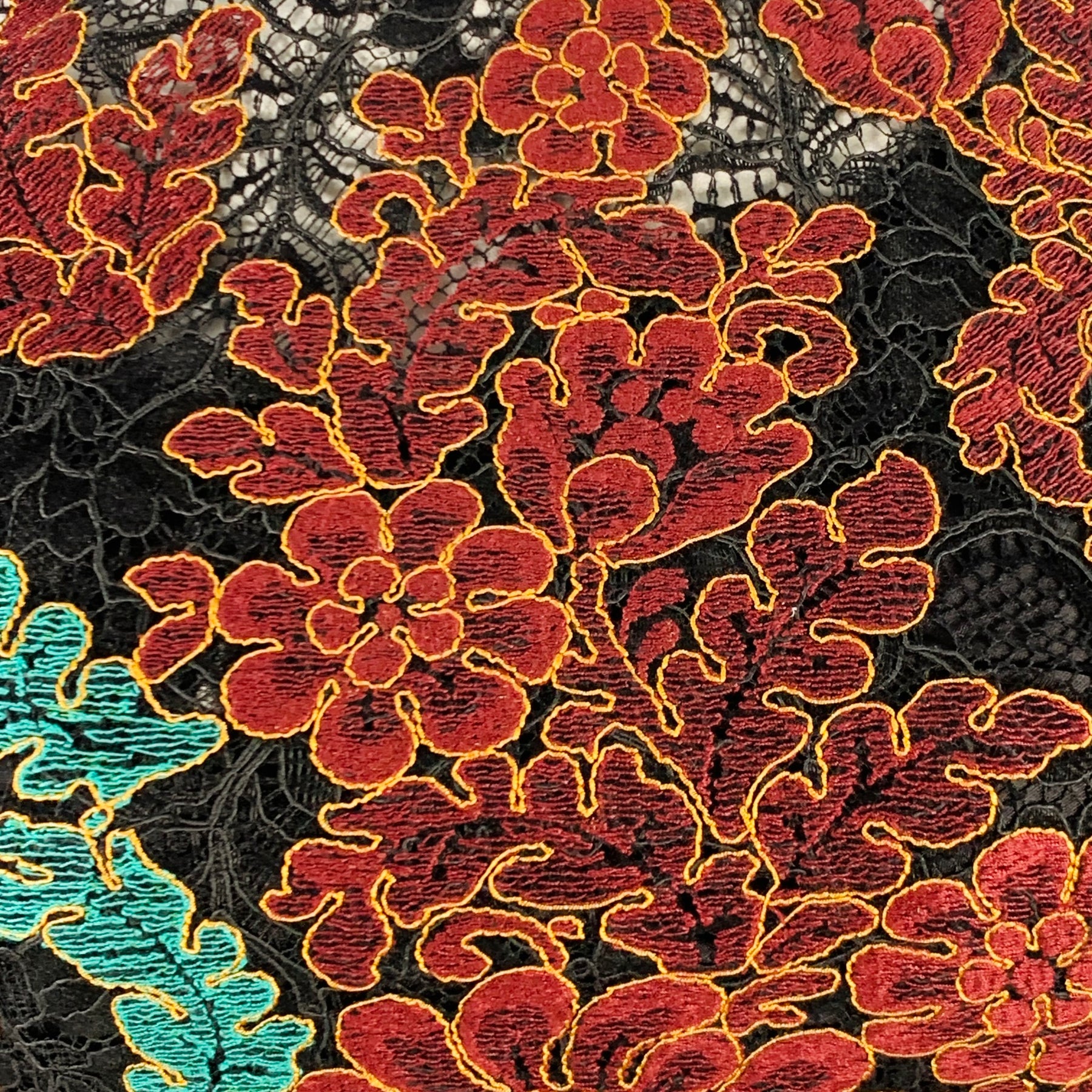 DOLCE & GABBANA dress in a black, green, and brown lace jacquard featuring a floral pattern, 3/4 sleeves, and back zipper closure. Comes with attached slip.