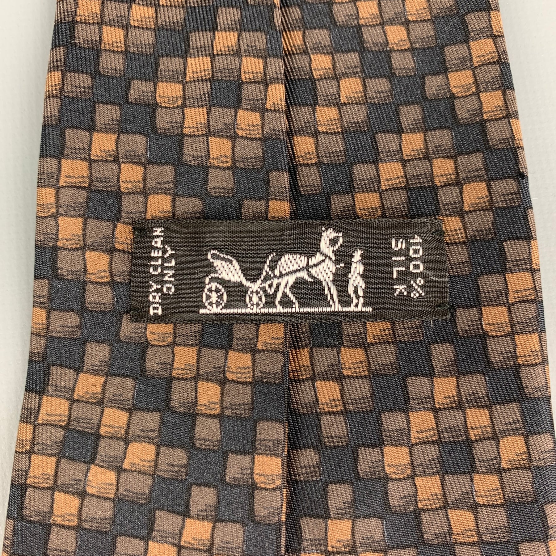 HERMES 398 EA Corbata de seda a cuadros marrón y negra