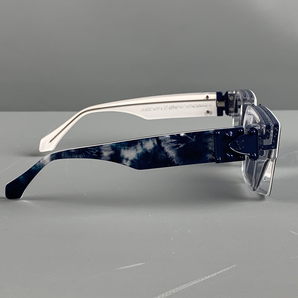 Las gafas de sol LOUIS VUITTON 1.1 Millionaires vienen en acetato azul y blanco y cuentan con un frente biselado profundo, un patrón de monograma azul detallado en la parte superior, lentes en tono azul completo y una bisagra S-lock de metal de color azul. Hecho en Italia.