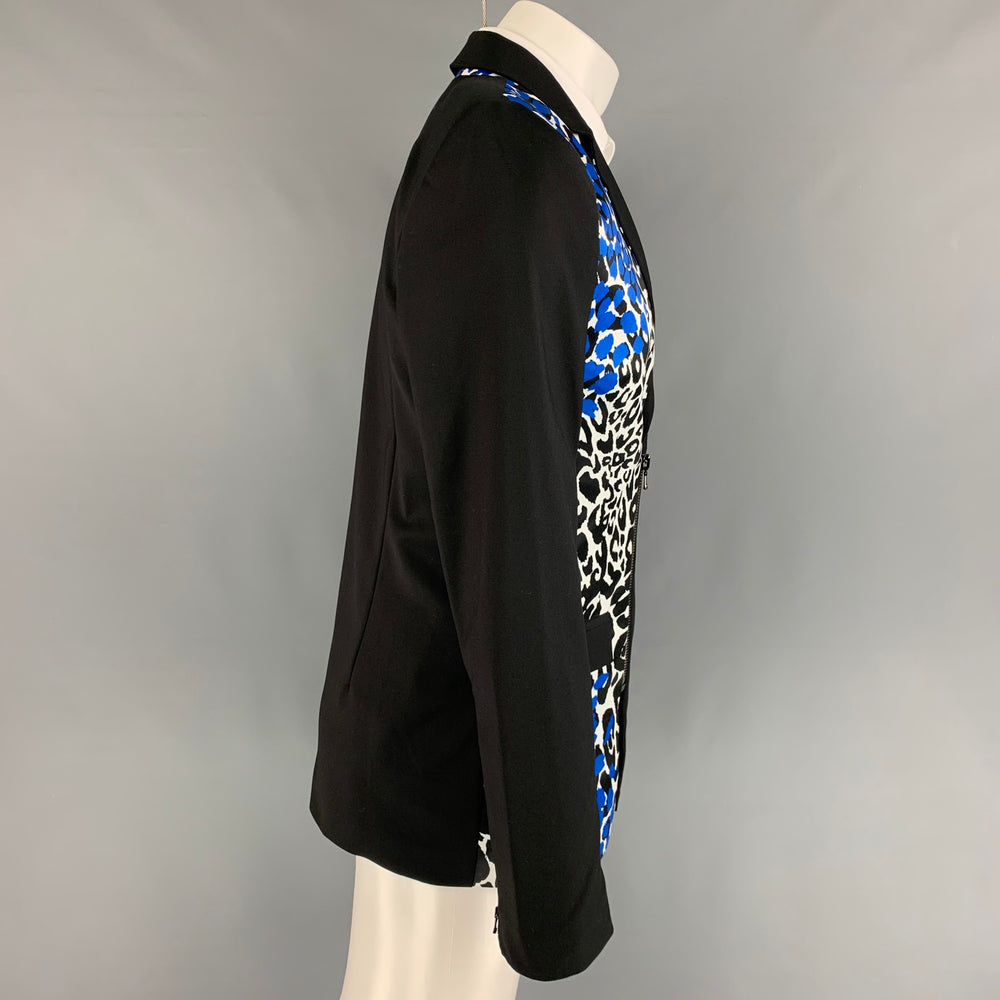 El abrigo deportivo MARCELL VON BERLIN viene en una mezcla de algodón negro con un panel con estampado animal azul y blanco, solapa de muesca, bolsillos con solapa, detalle de botón a presión, puños con cremallera y cierre asimétrico con cremallera. Fabricado en la UE