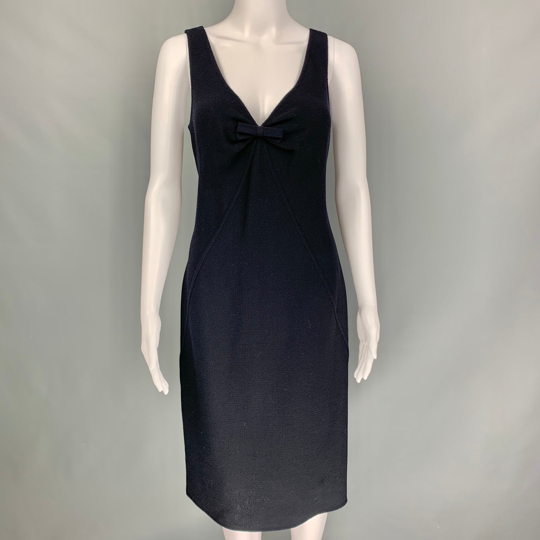 El vestido de cóctel OSCAR DE LA RENTA para Saks Fifth Avenue Resort 2007 viene en lana azul marino con un detalle de lazo en el centro del frente, cuello en V, sin mangas y cierre de cremallera invisible en el centro de la espalda. Hecho en Italia.