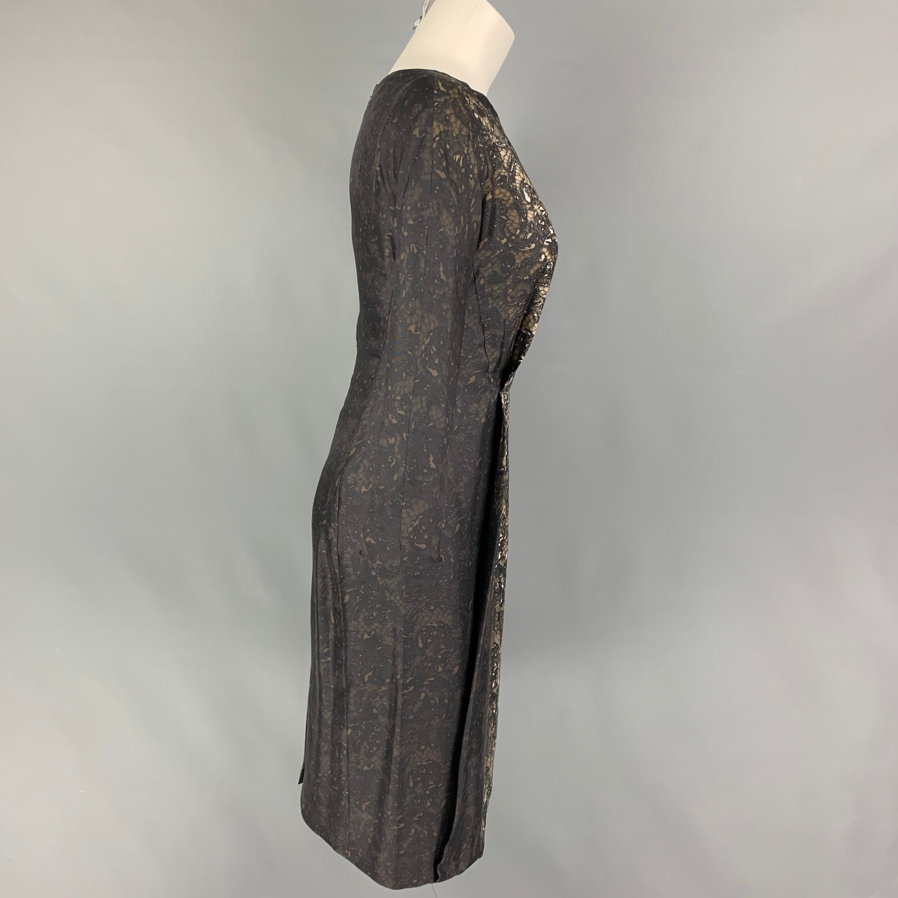 PRADA Talla 2 Vestido de mangas 3/4 con estampado de encaje de seda negro y marrón