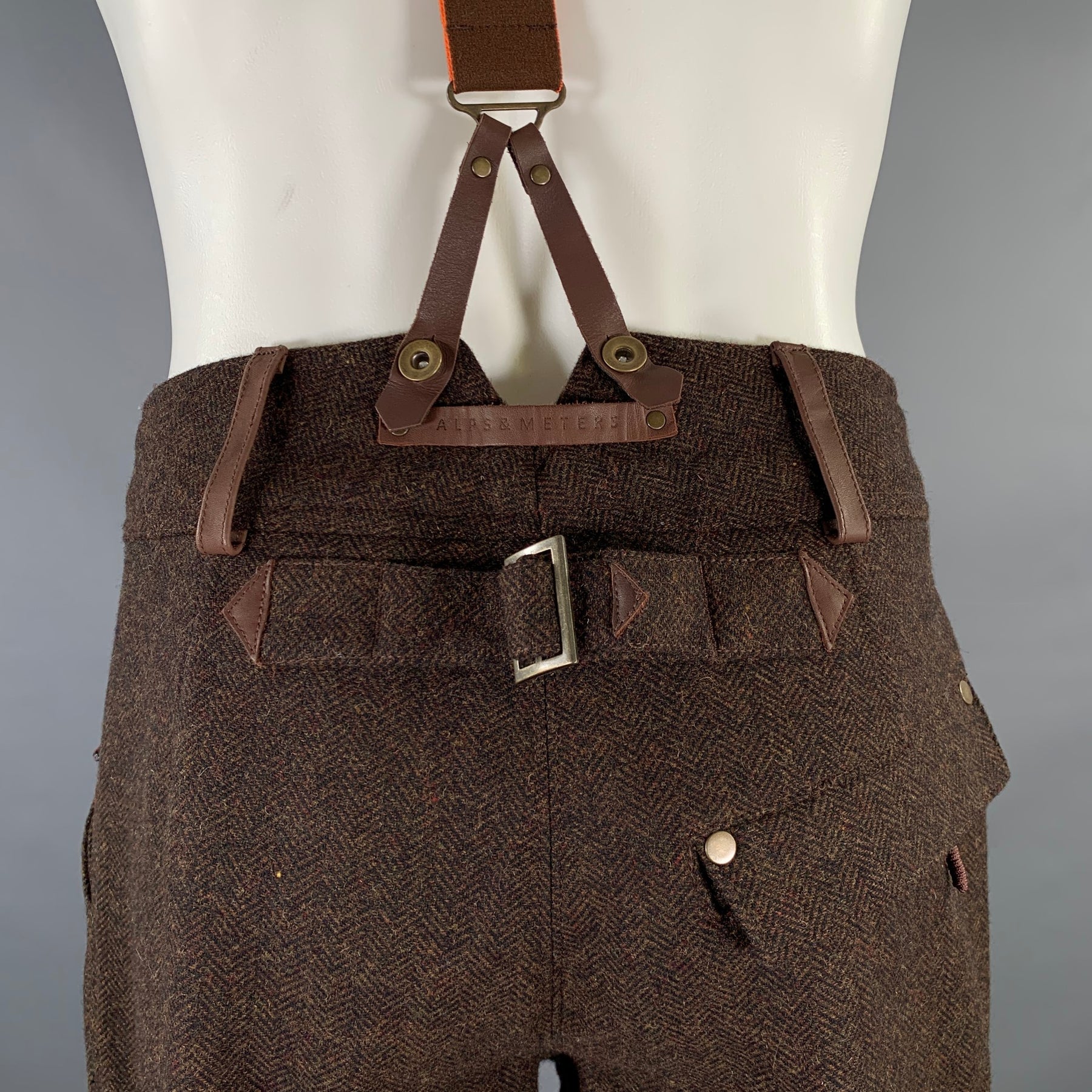 ALPS AND METERS technical Alpine Winter Trousers, expertly crafted from a water-repellent wool blend. They combine a traditional herringbone pattern with a waterproof membrane and adjustable suspenders for maximum warmth and classic mountain style.