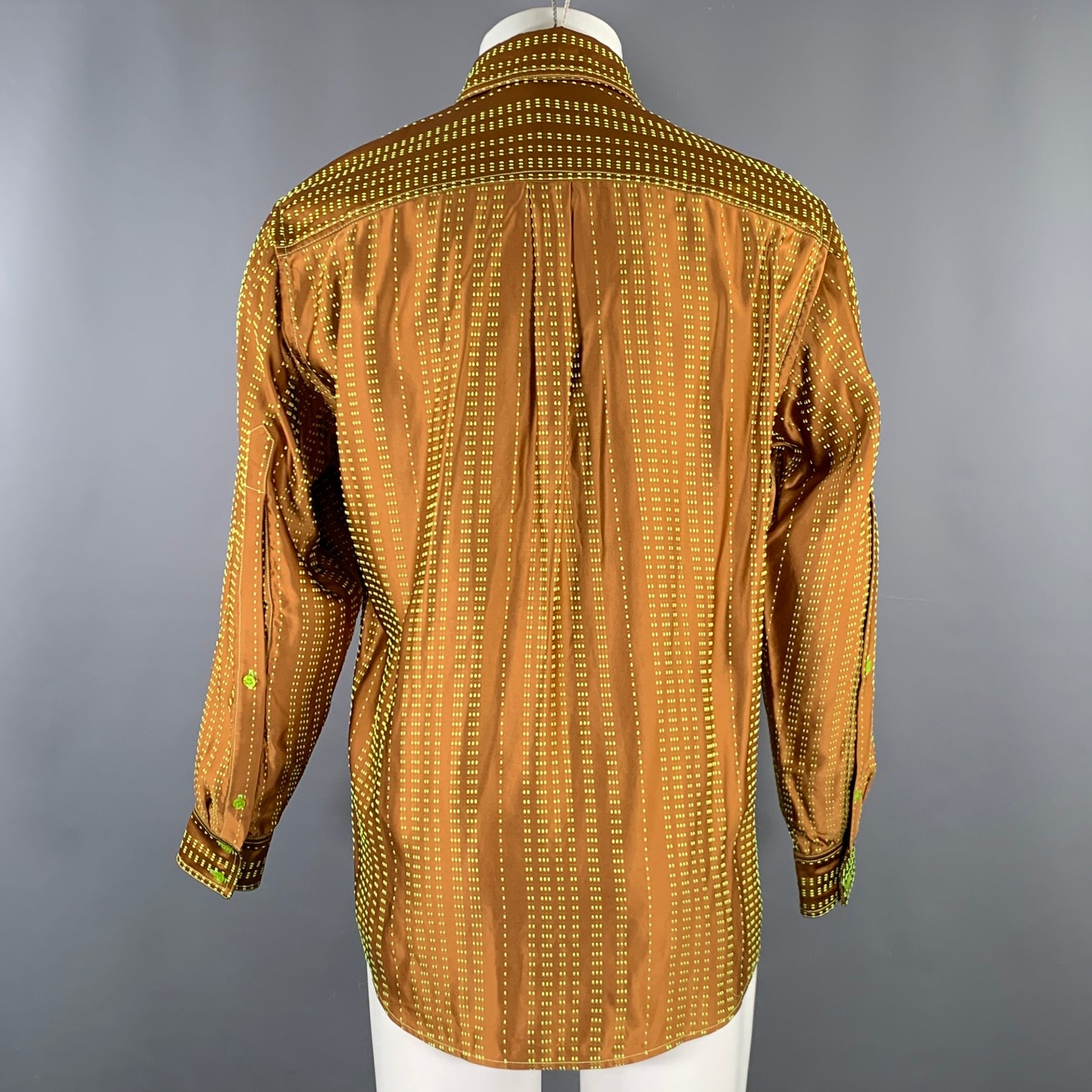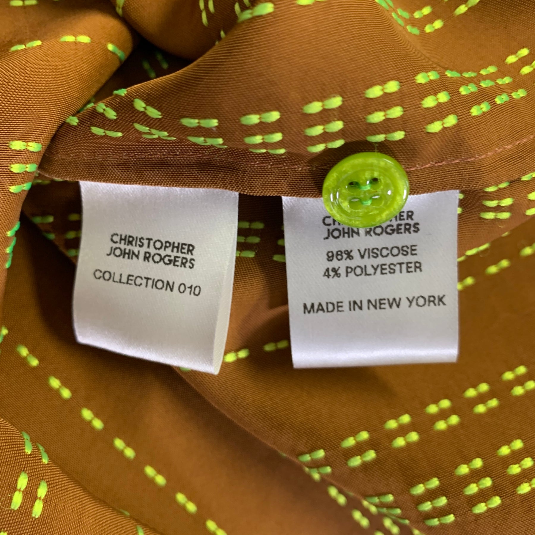 CHRISTOPHER JOHN ROGERS this striking copper brown long sleeve shirt, meticulously crafted in the United States from a smooth viscose blend. Part of Collection 010, it showcases vibrant chartreuse green stitched stripes and a unique oversized arm placket for a modern look.