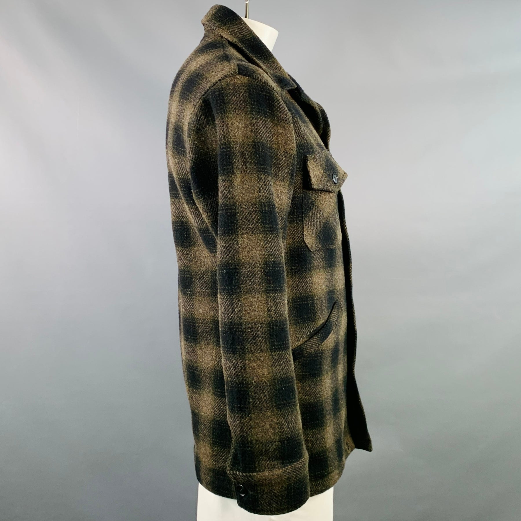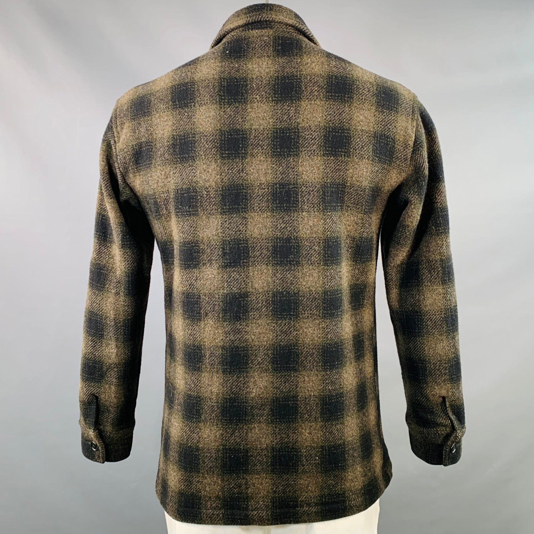 PENDLETON worker jacket in a brown and black wool featuring a checkered pattern, four pockets (two flap buttoned, two slip), and button closure.