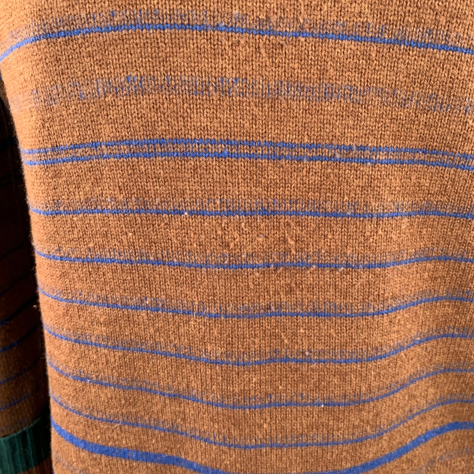 SACAI sweater in a brown, blue, and orange wool knit featuring a stripe pattern, one pocket, cuffed sleeves with green trim, and crew neck.