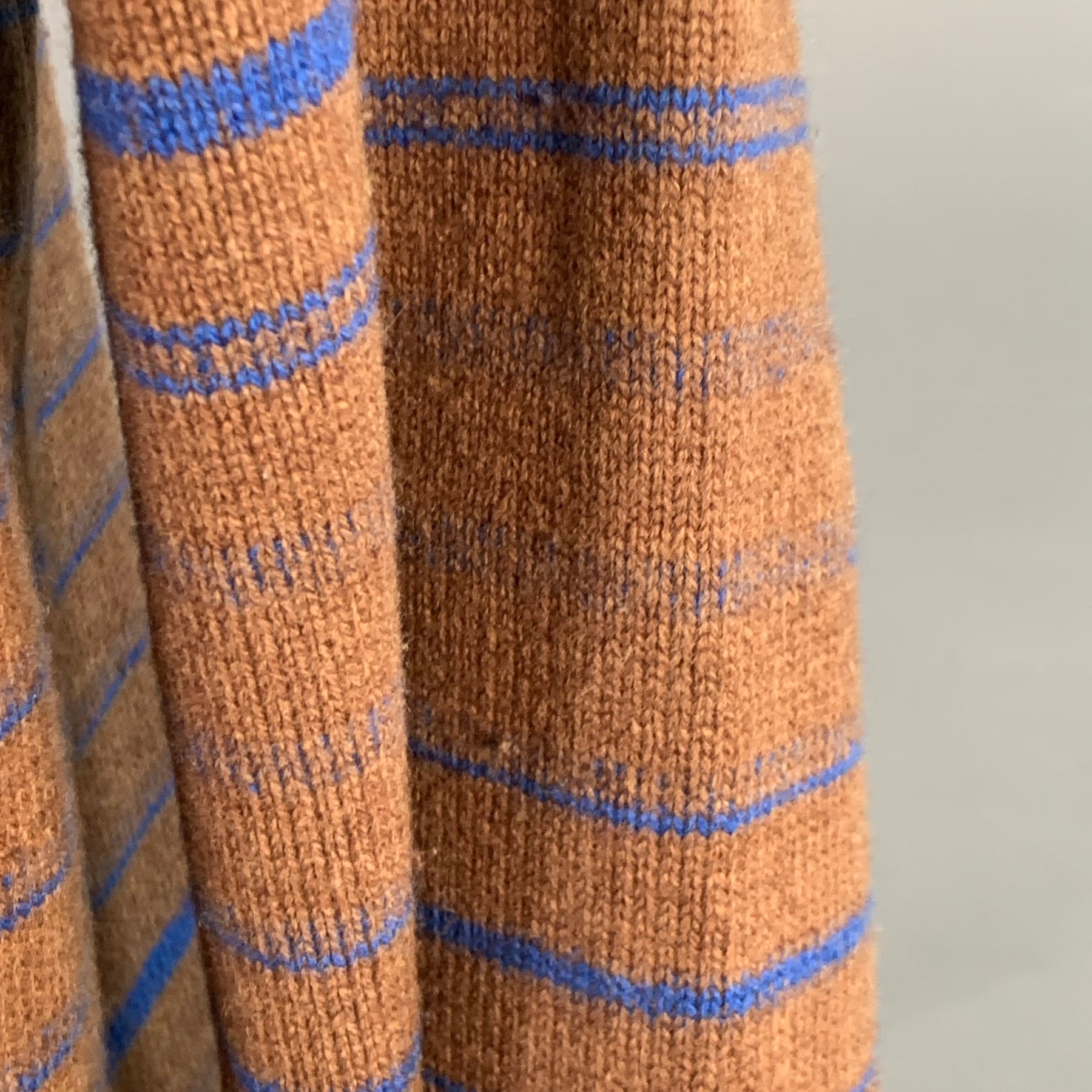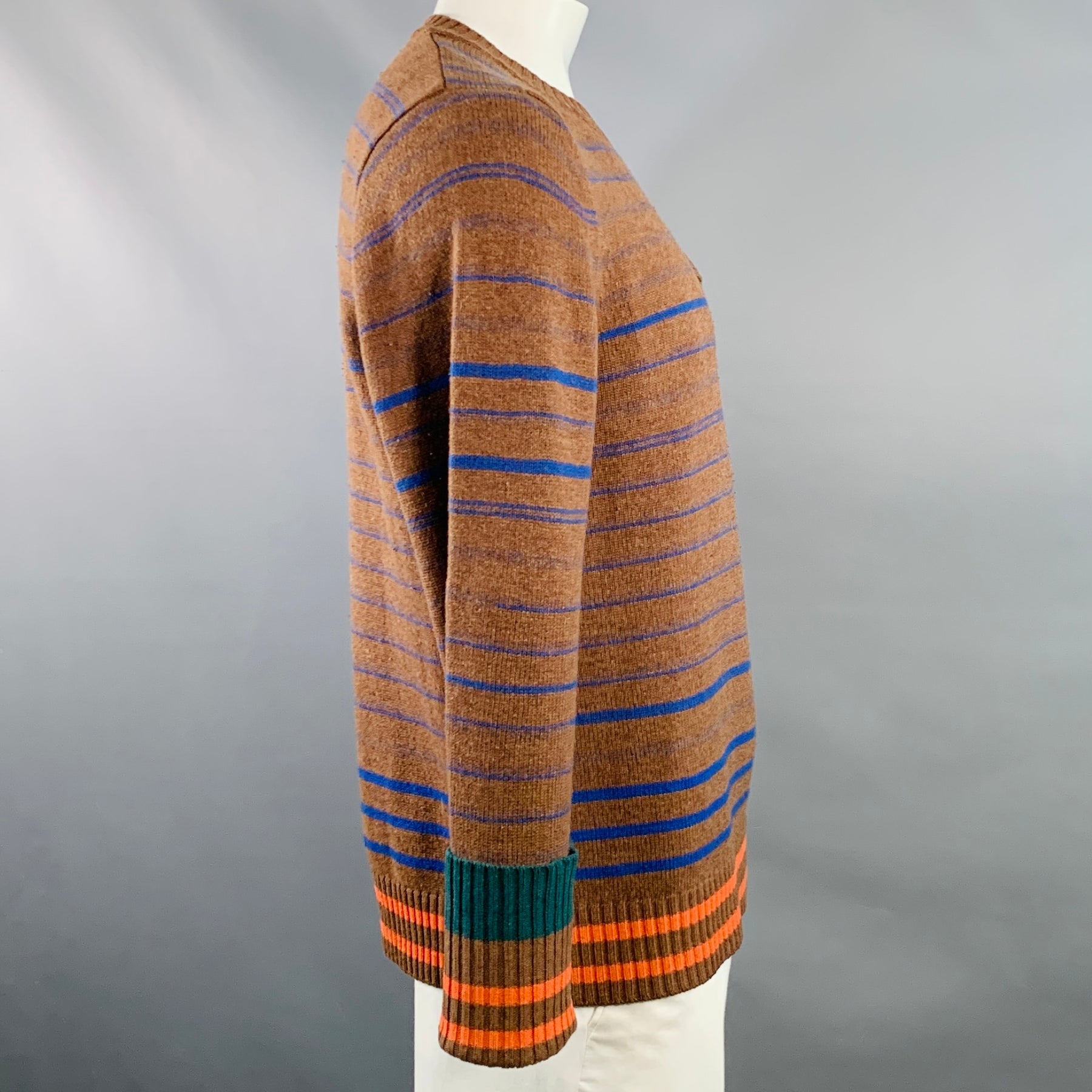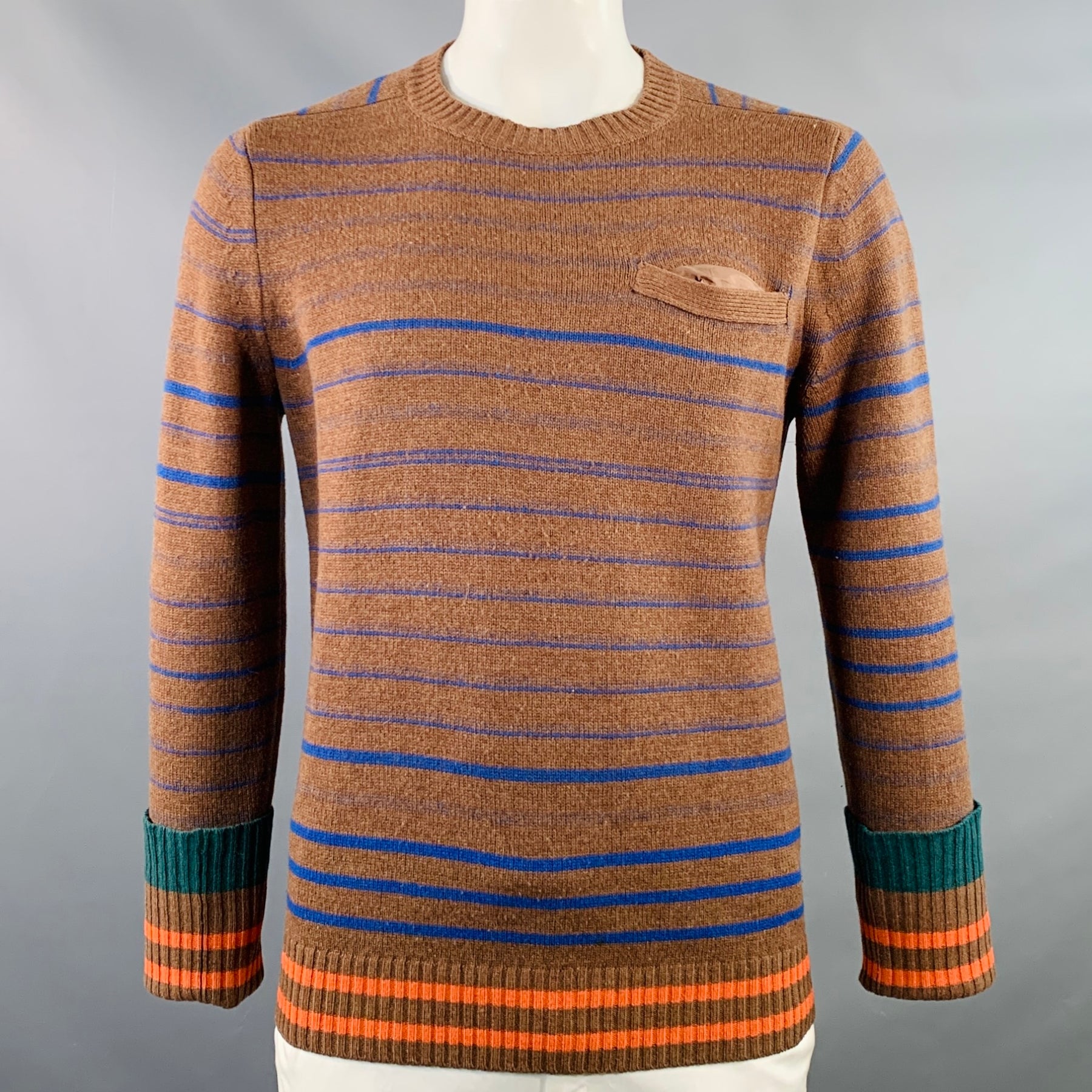 SACAI Size XL Brown Blue Orange Stripe Wool One Pocket Crew Neck Sweater