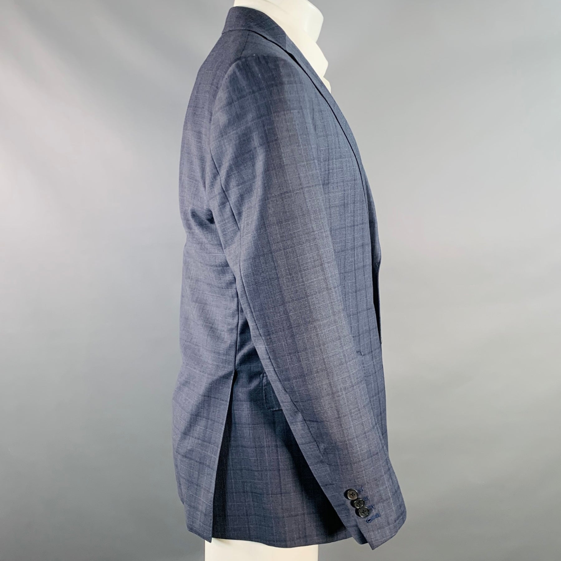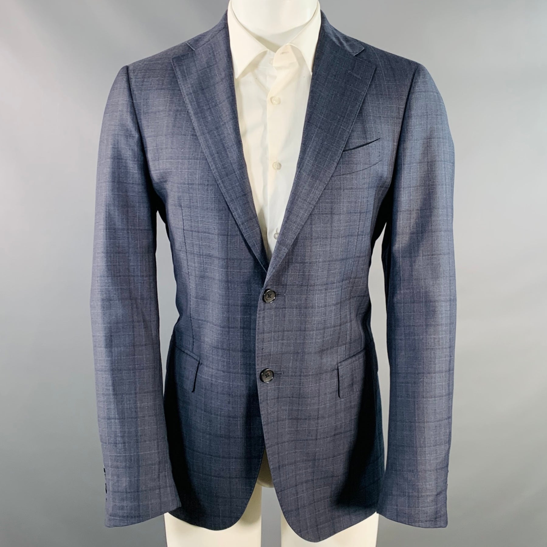 SALVATORE FERRAGAMO sport coat in a navy and blue virgin wool fabric featuring a checkered pattern, notch lapel, double vented back, and doule button closure.