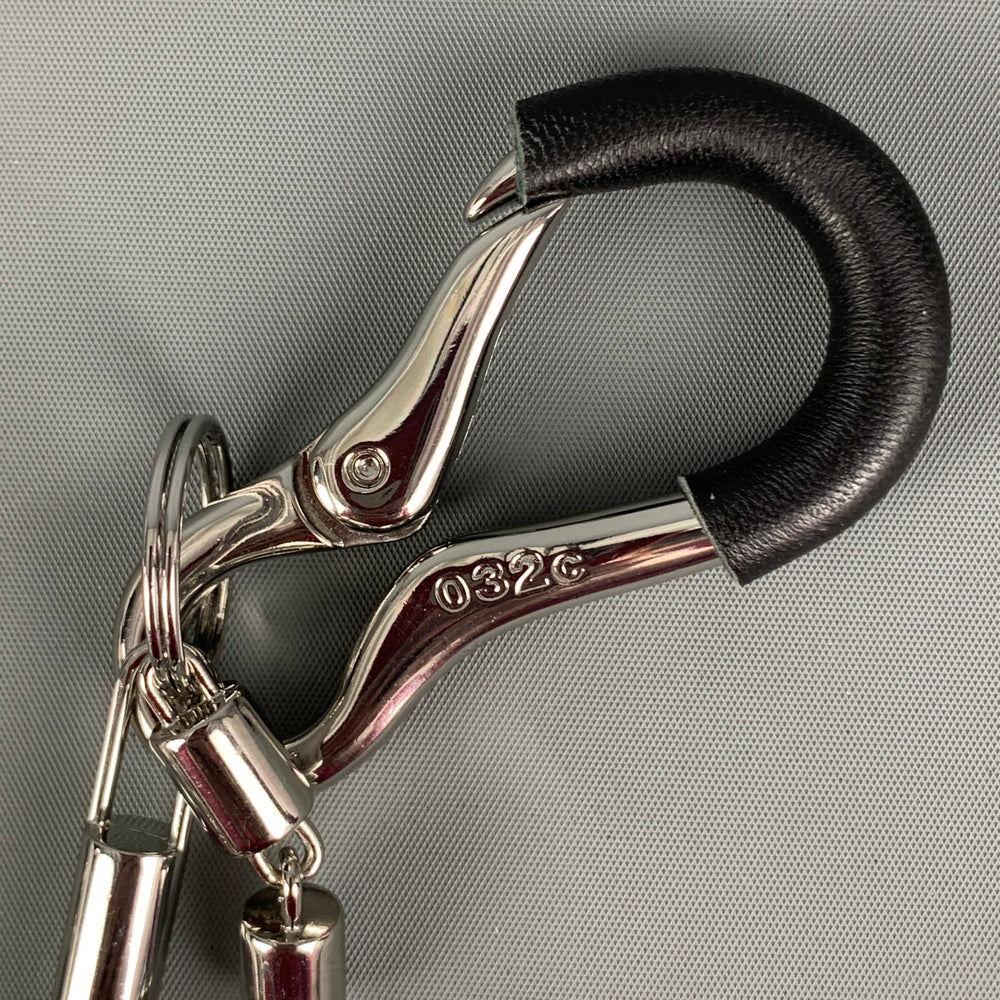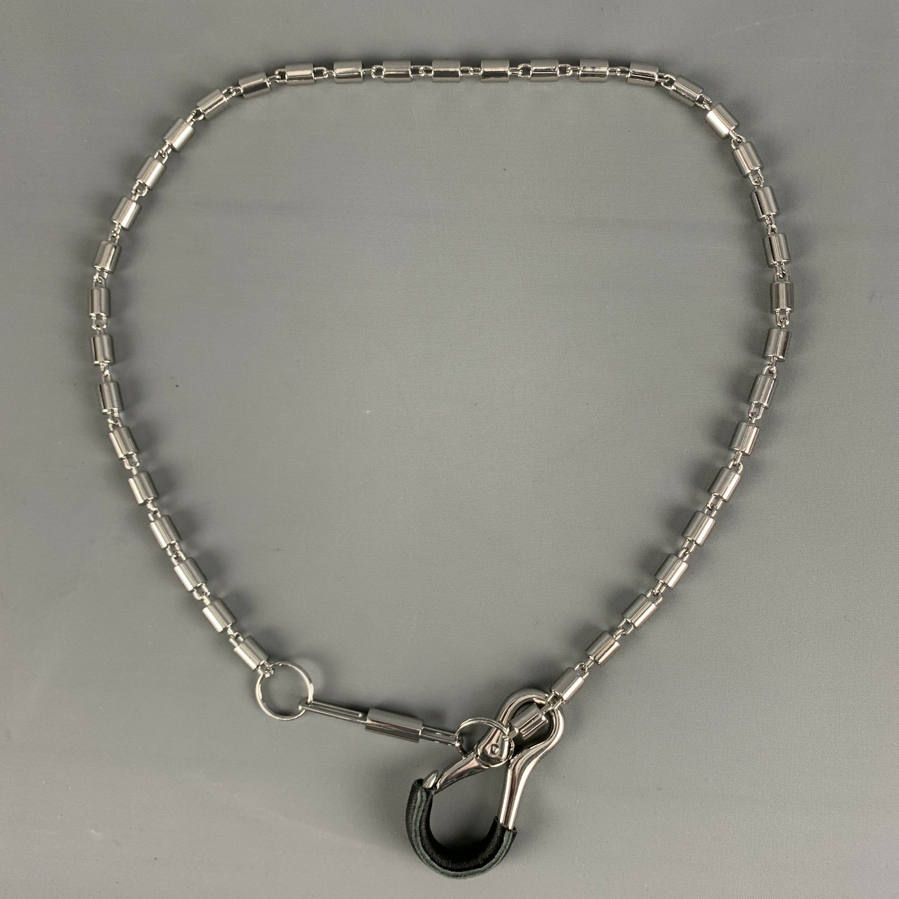 032C necklace comes in a silver tone metal chain link featuring a black leather detail at the carabiner.