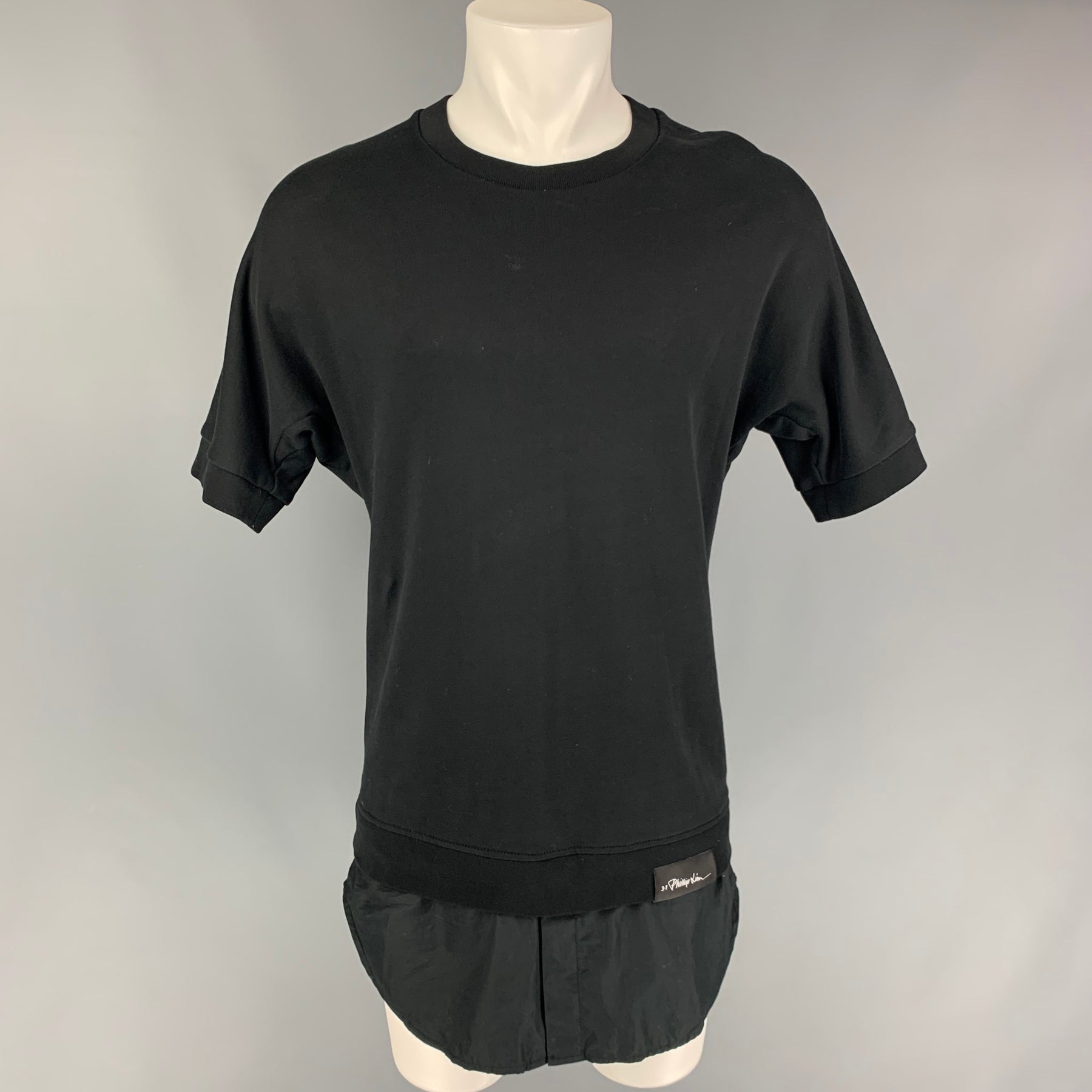 3.1 PHILLIP LIM pullover comes in a black cotton featuring a shirt panel, short sleeves, and a crew-neck.