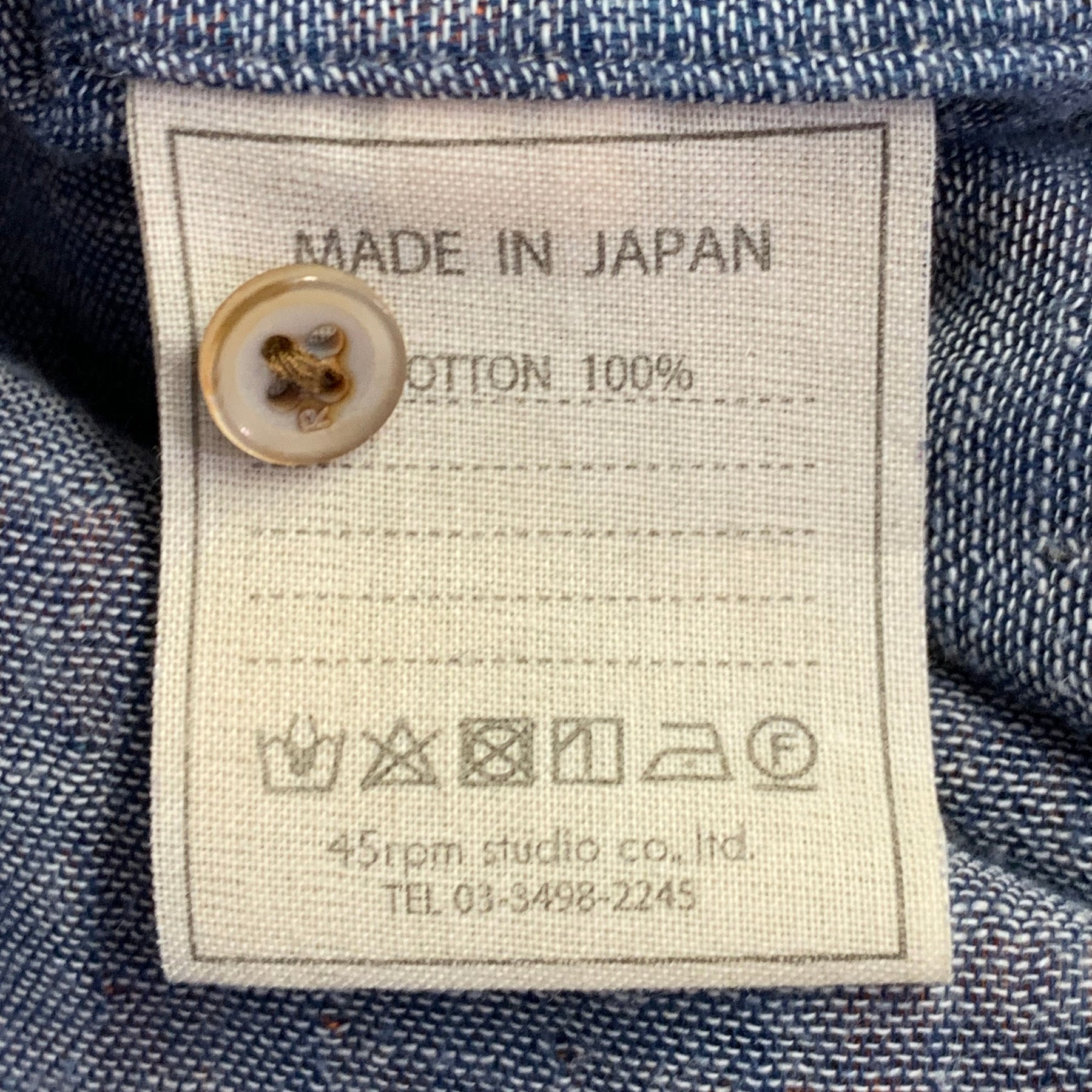 45rpm long sleeve shirt in a blue and orange cotton flannel featuring a plaid pattern, curved cutaway collar, and button closure. Made in Japan.