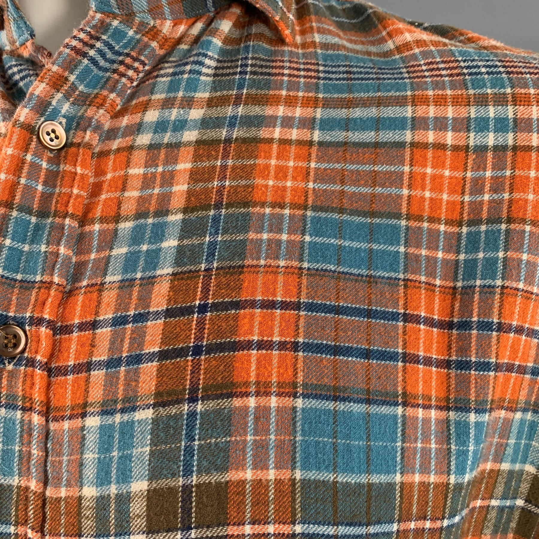 45rpm Size XL Blue Orange Plaid Cotton Curved Cutaway Flannel Long Sleeve Shirt