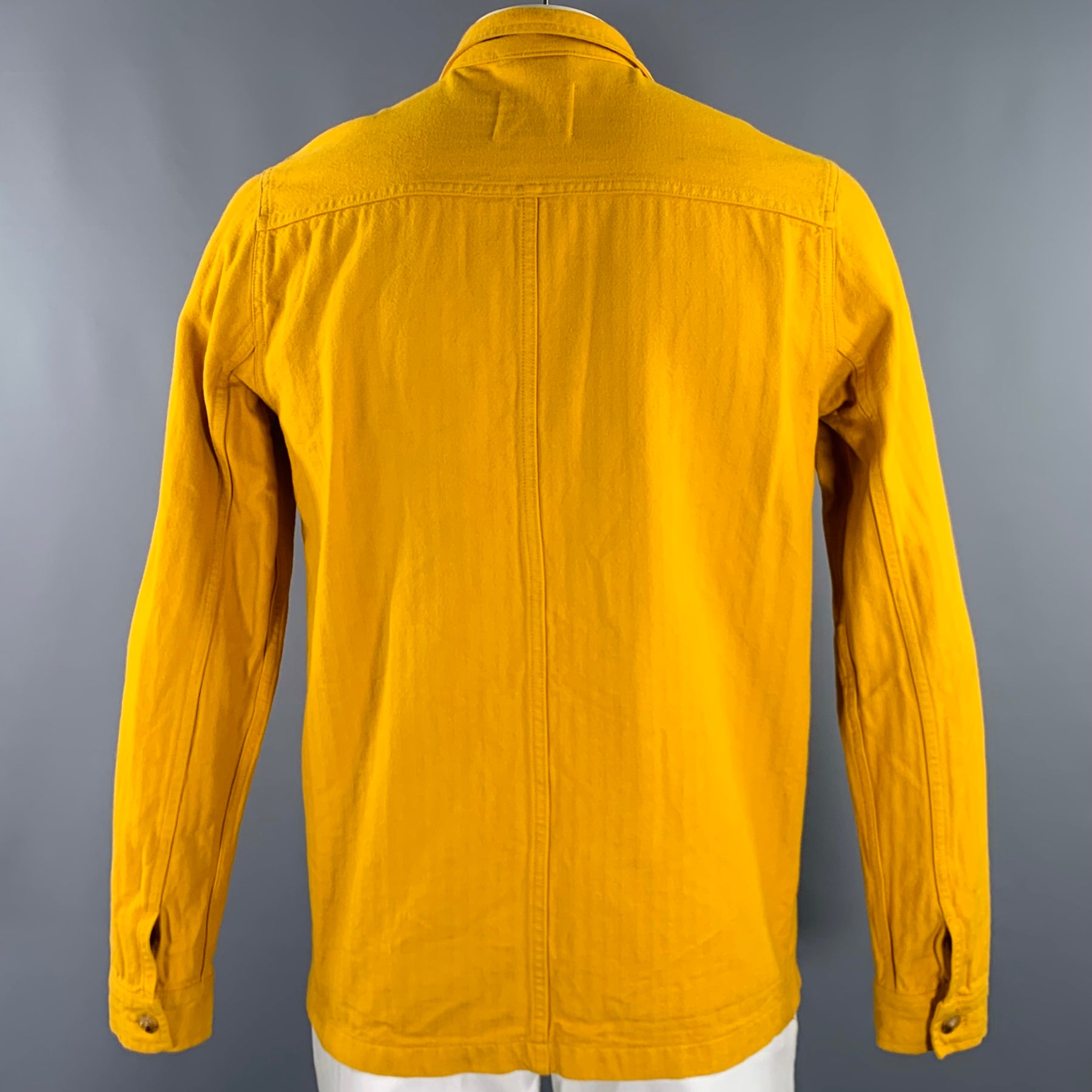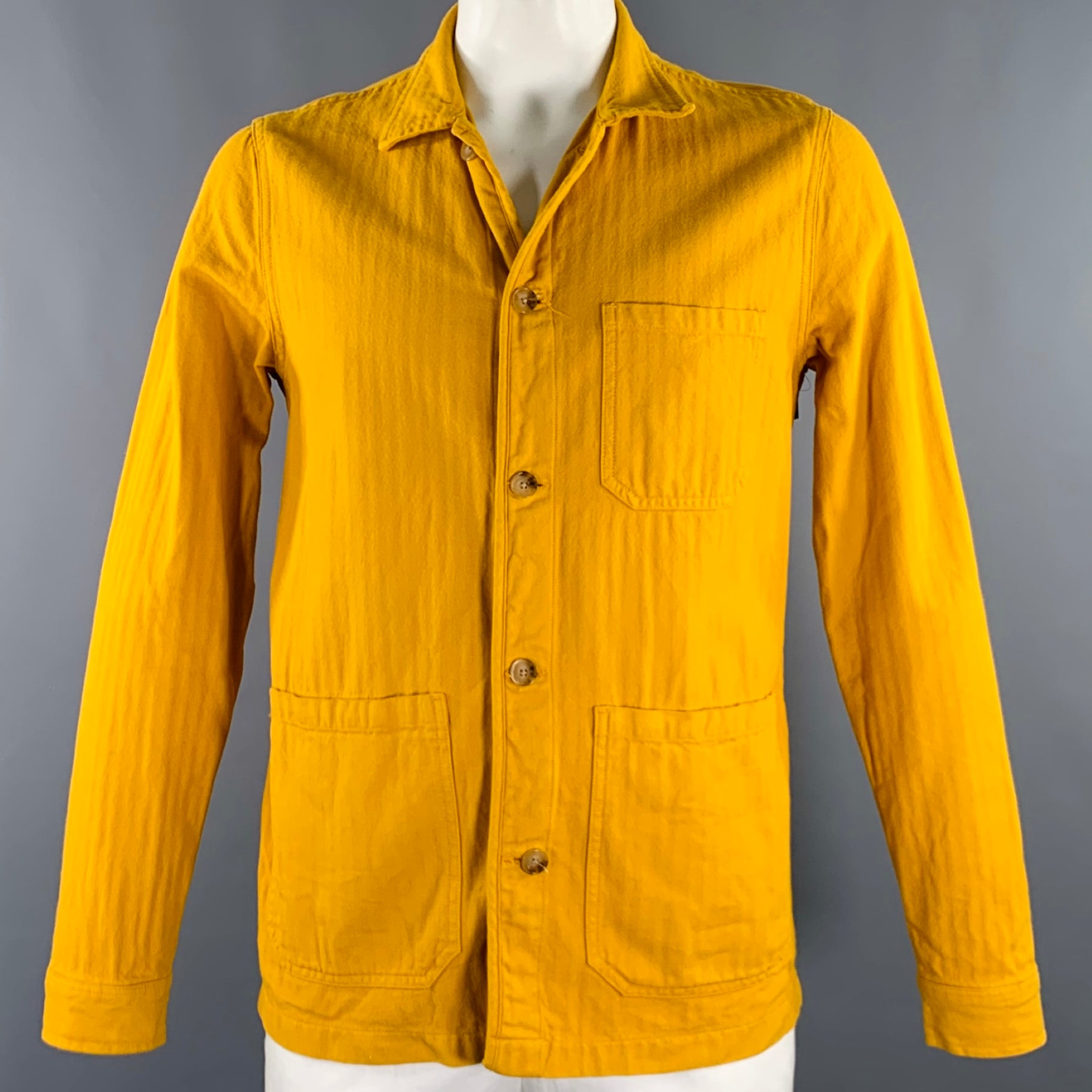 A DAY'S MARCH jacket in a mustard yellow cotton woven fabric featuring herringbone pattern, worker/chore jacket style, and button closure.