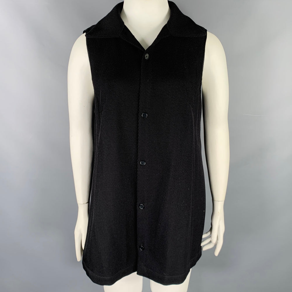 AKRIS trench coat in a metallic gold tone polyester blend fabric featuring a single breasted style with belt, detachable vest, and hidden button closure. Made in Romania.