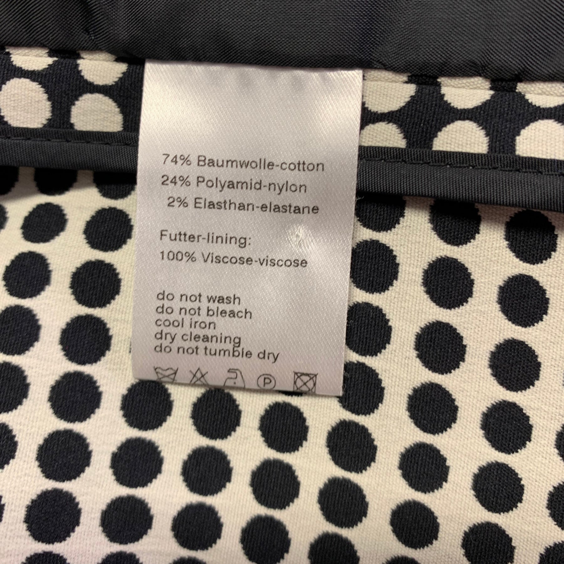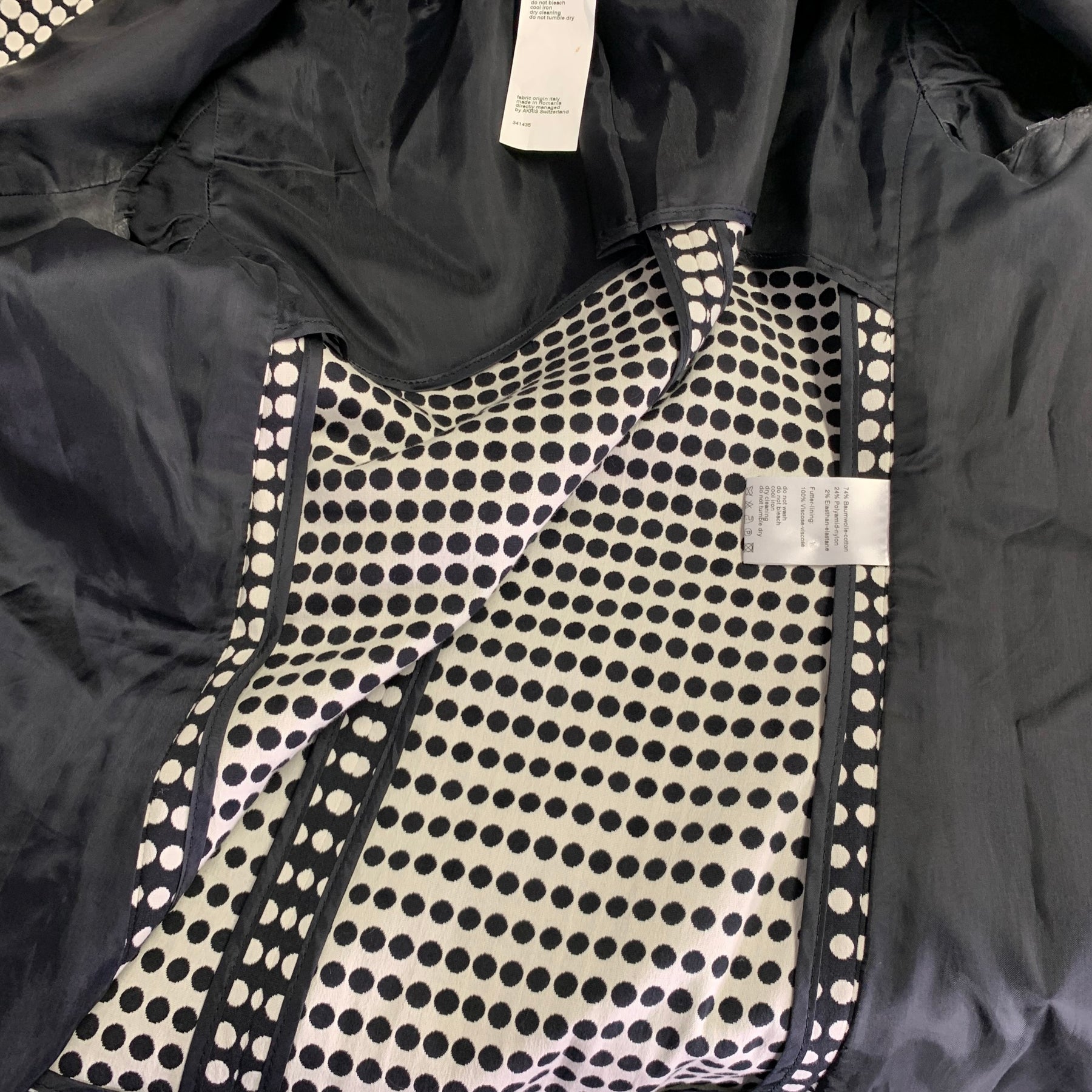 AKRIS dress & jacket set in a black and white polka dot cotton blend fabric and includes a notch lapel jacket with snap closure and inverse matching sleeveless dress with front zipper closure. Made in Romania.