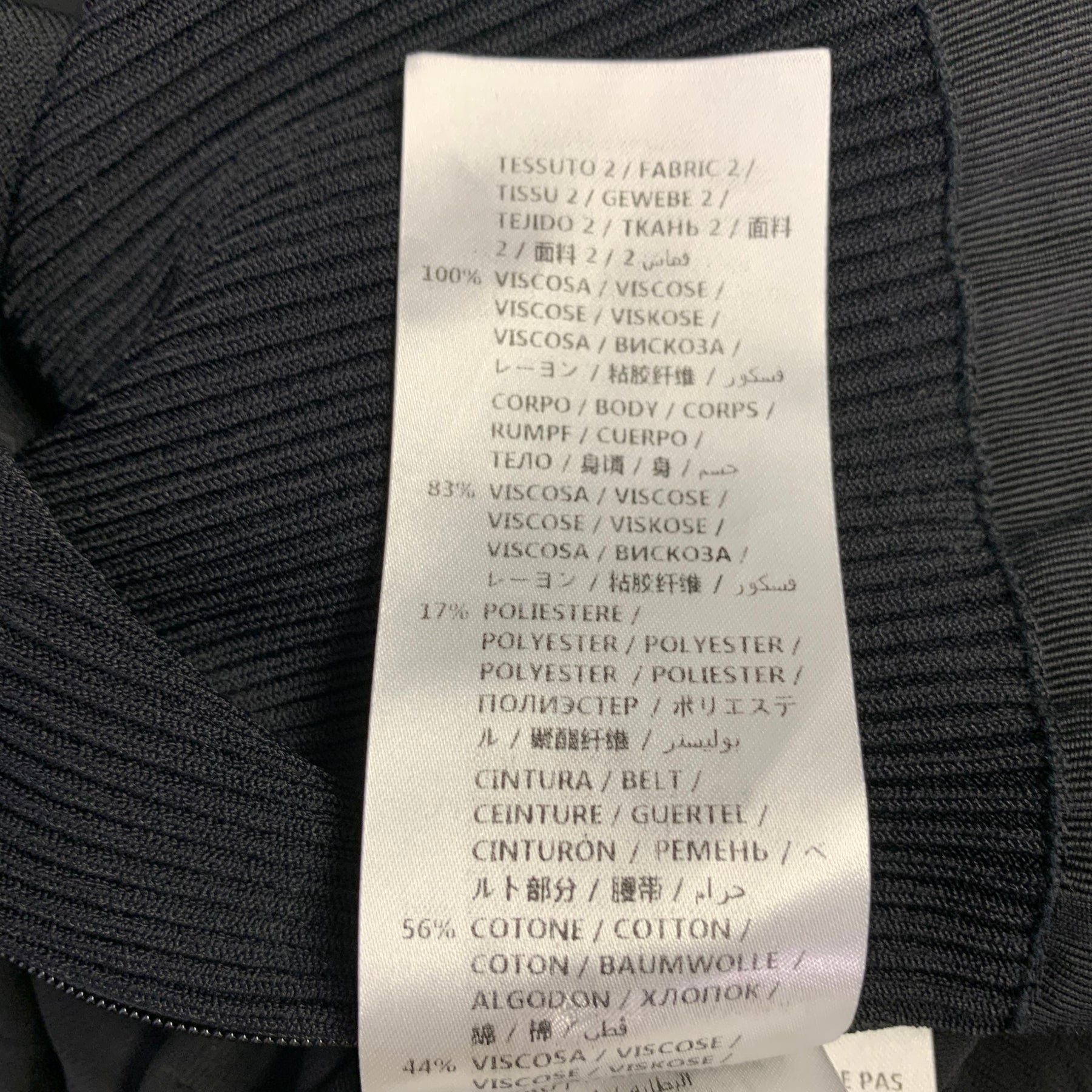ALEXANDER MCQUEEN dress in a black viscose featuring a stretchy jersey bodice with boat neck and 3/4 sleeves, pleated skirt, and ribbon belt detail with silver tone metal hardware. Made in Italy.