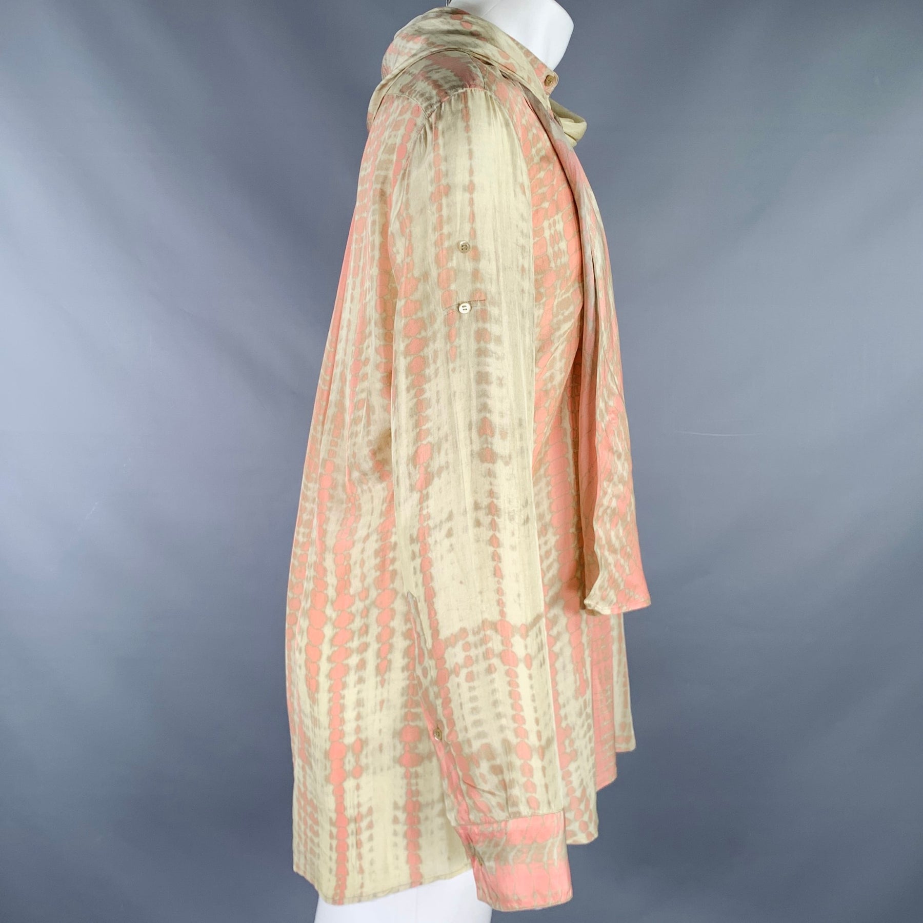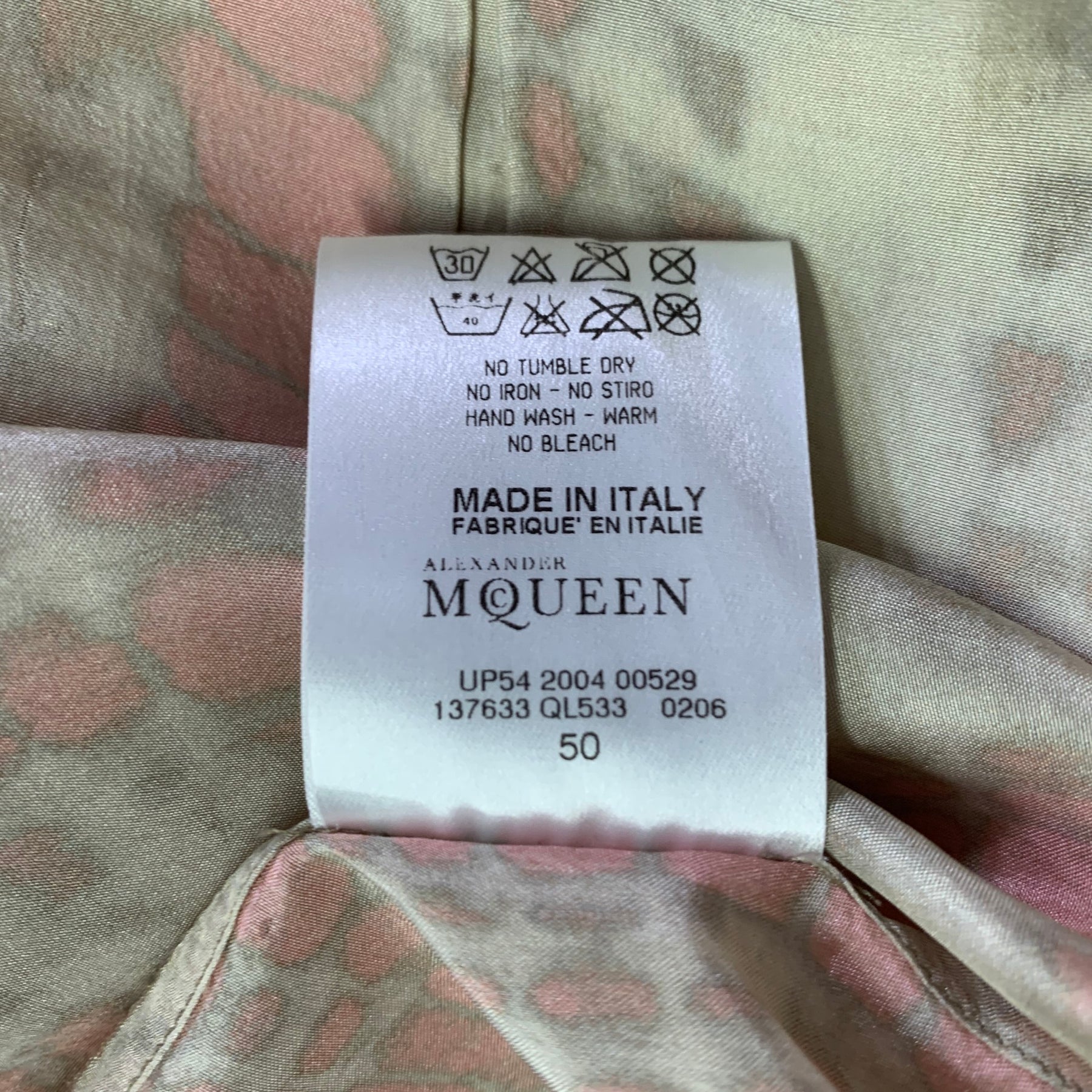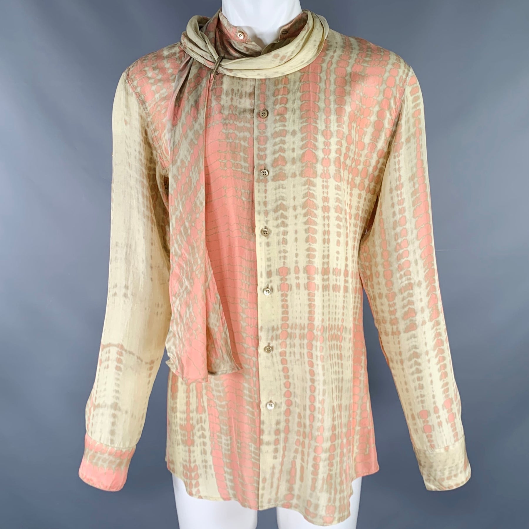 ALEXANDER MCQUEEN long sleeve shirt in a khaki and pink dyed silk fabric featuring a snakeskin pattern, nehru collar, and scarf trim. Made in Italy.