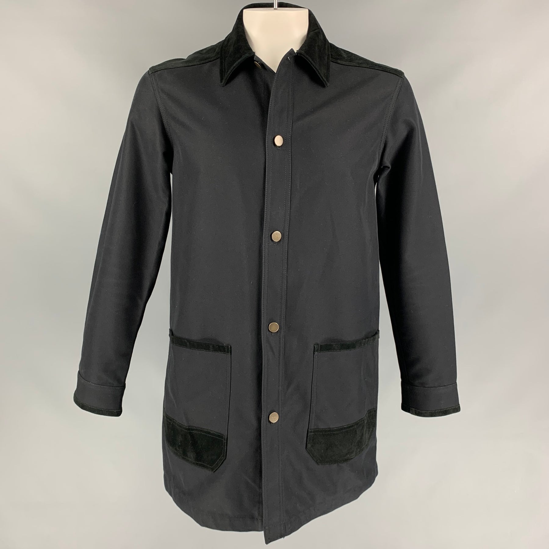ALEXANDER WANG coat comes in a black nylon / cotton with a suede trim featuring a loose fit, patch pockets, spread collar, cut-out details, single back vent, and a buttoned closure.