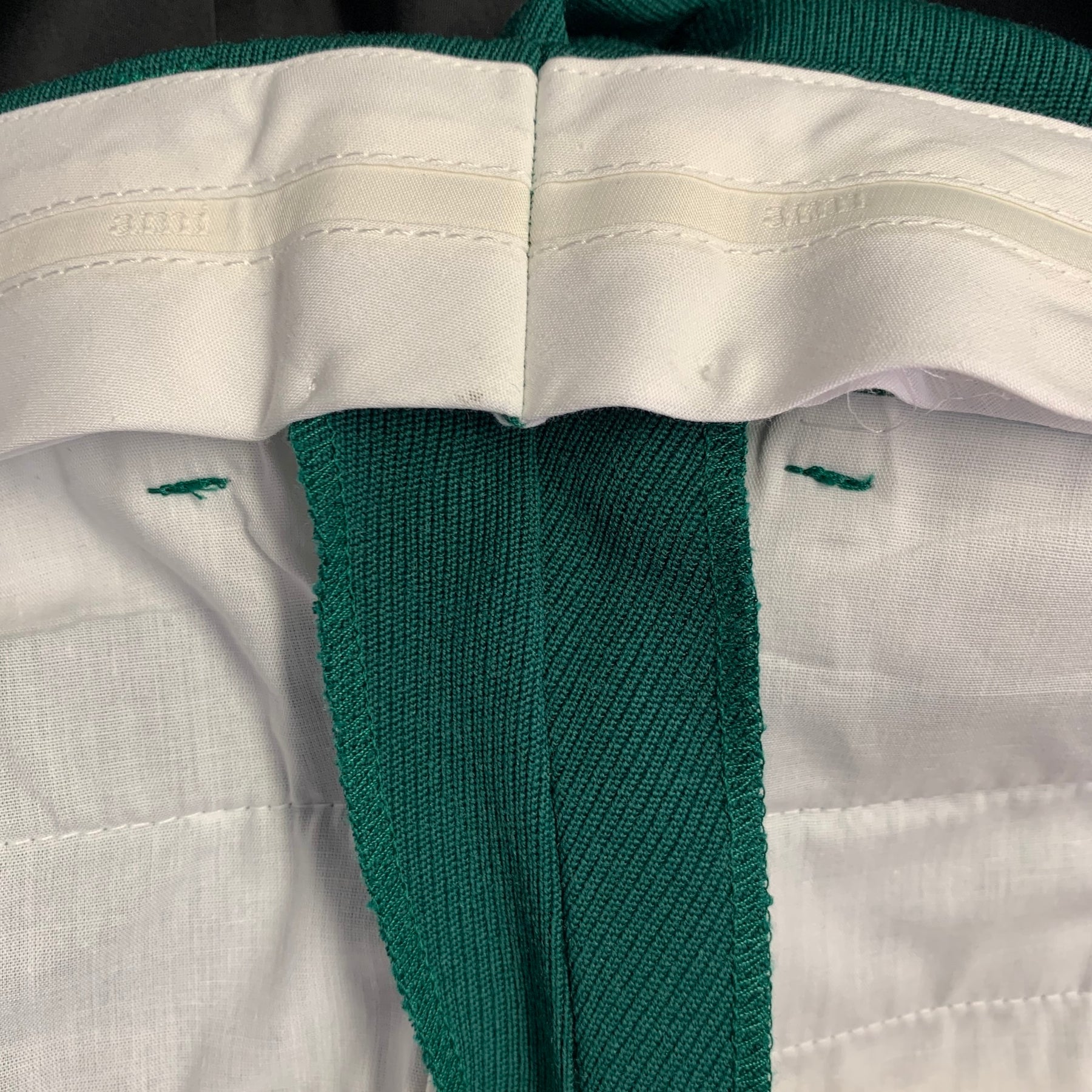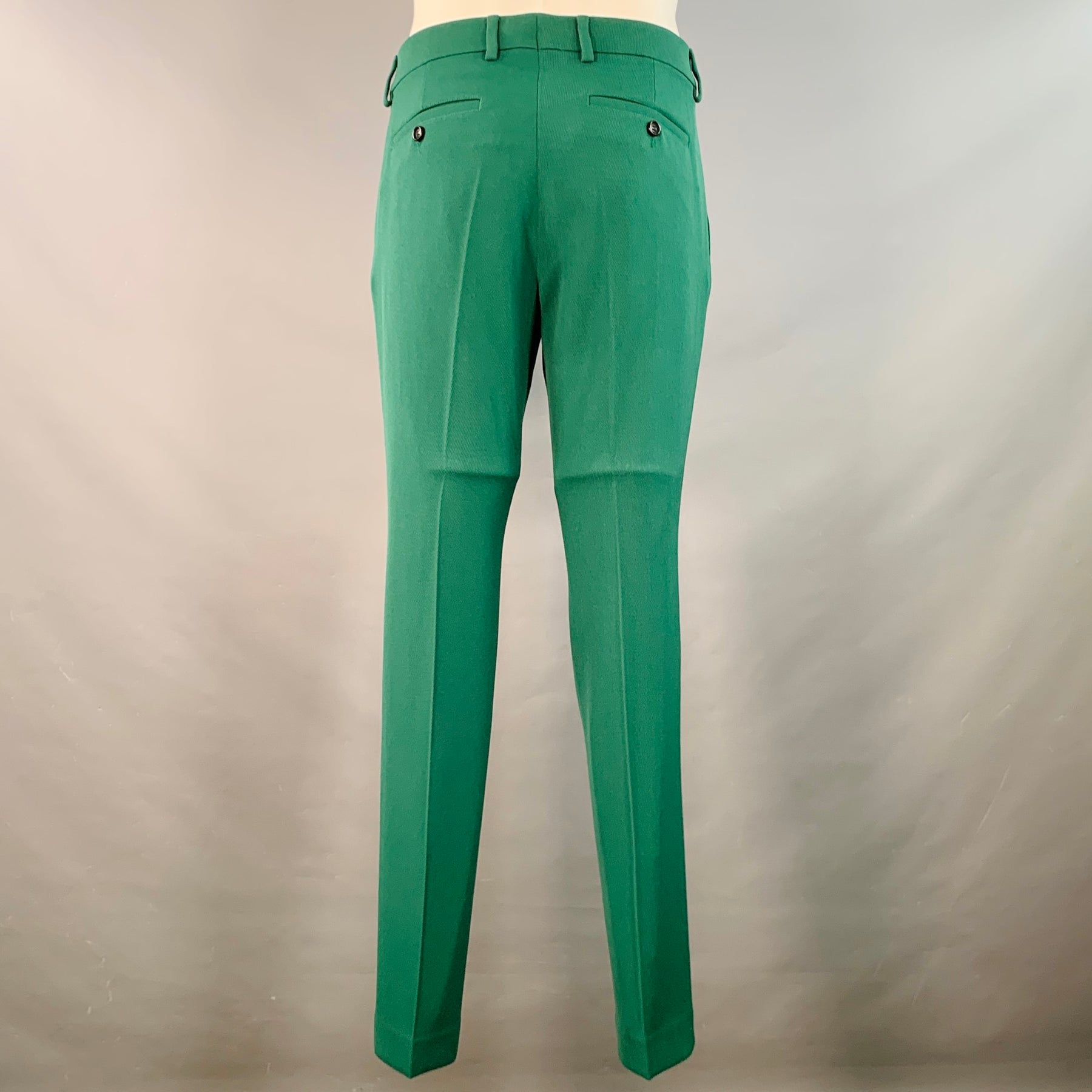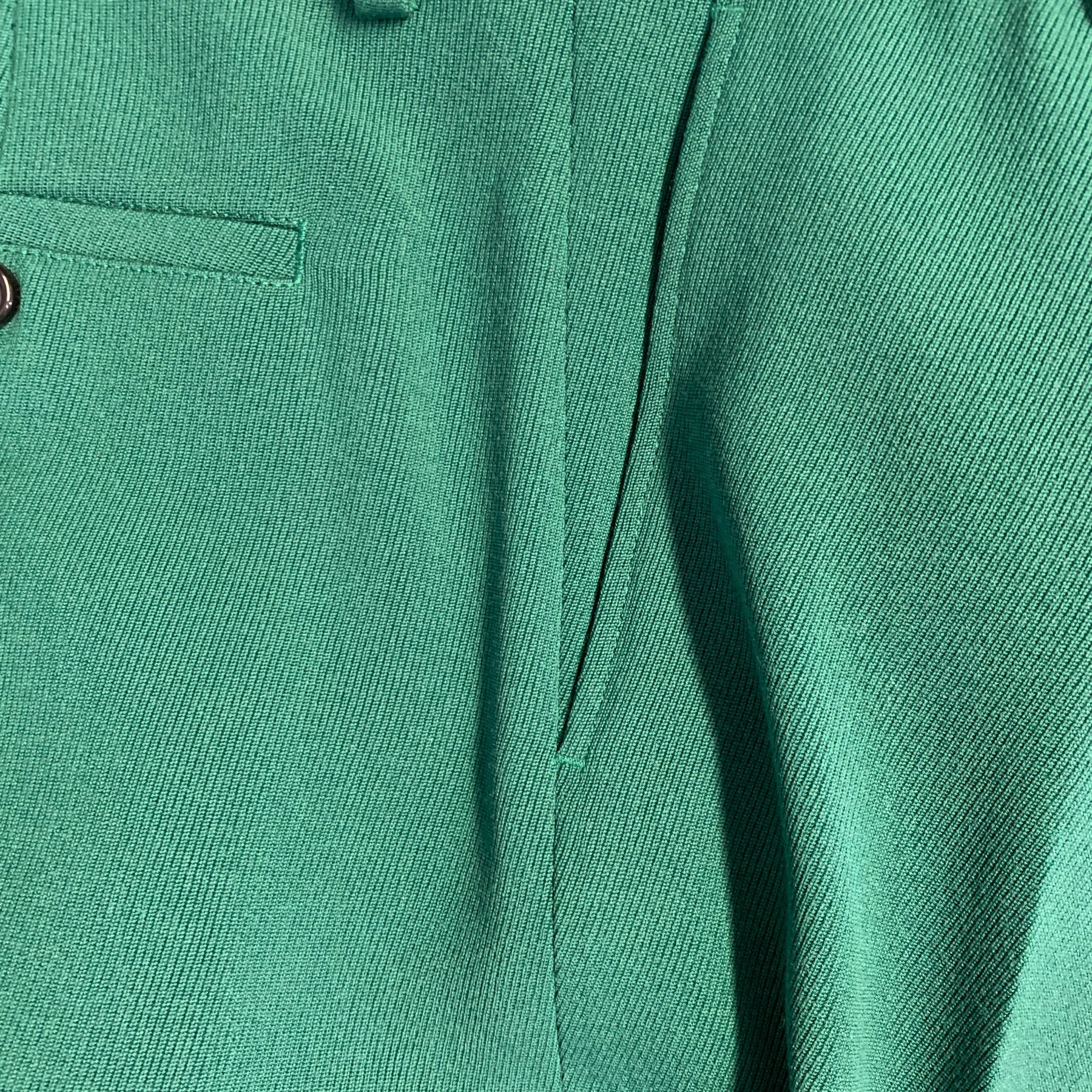 AMI by ALEXANDRE MATTIUSSI suit in a green wool with a full liner and includes a single breasted, two hidden button sport coat with notch lapel and matching flat front trousers. Made in Italy.
