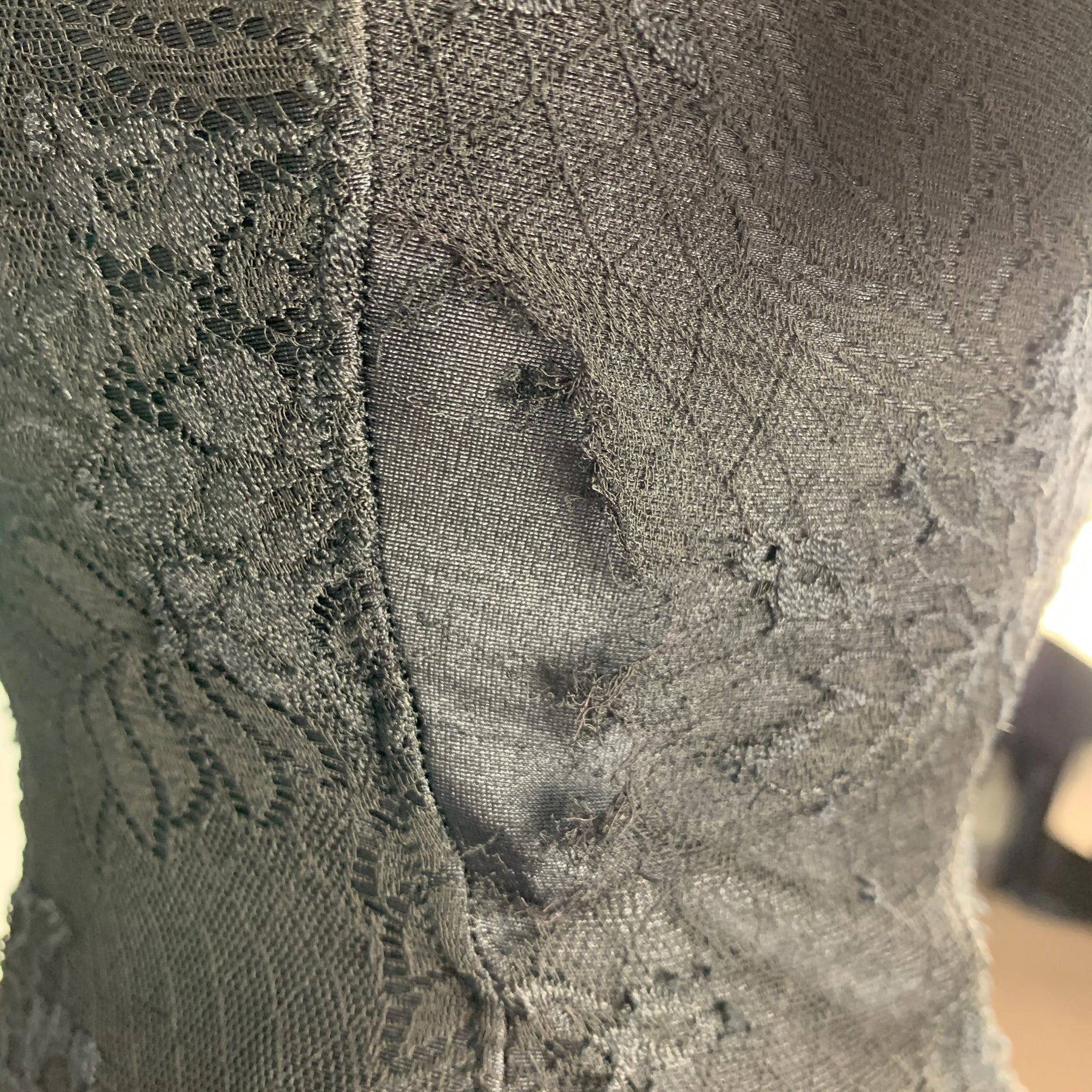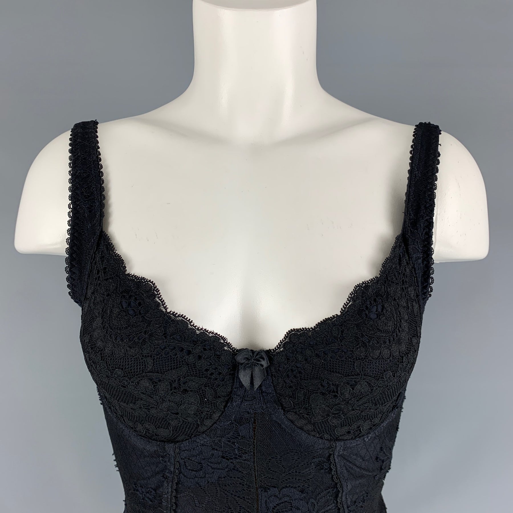BALENCIAGA cocktail dress comes in black lace knit material featuring a corset design, and body con shape. Made in France.