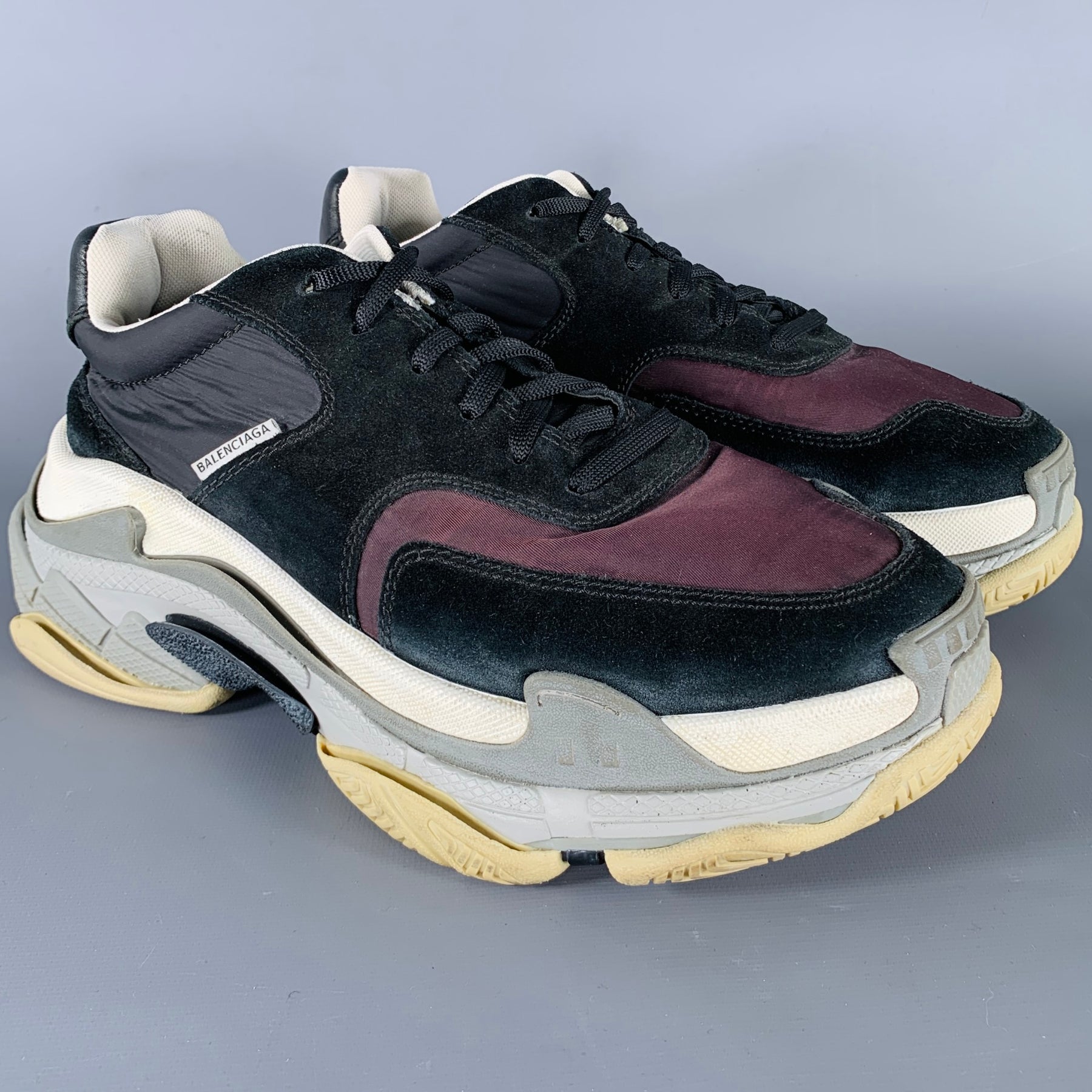 BALENCIAGA "Triple S" sneakers in black suede and nylon fabrics featuring an athletic style and chunky rubber sole. Made in Italy.