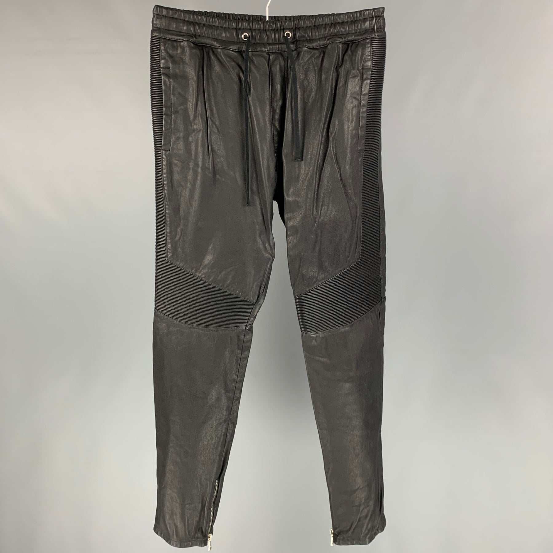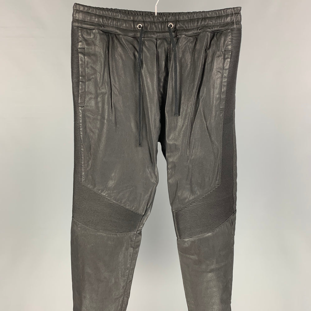 BALMAIN Size XL Black Leather Elastic Waistband Casual Pants