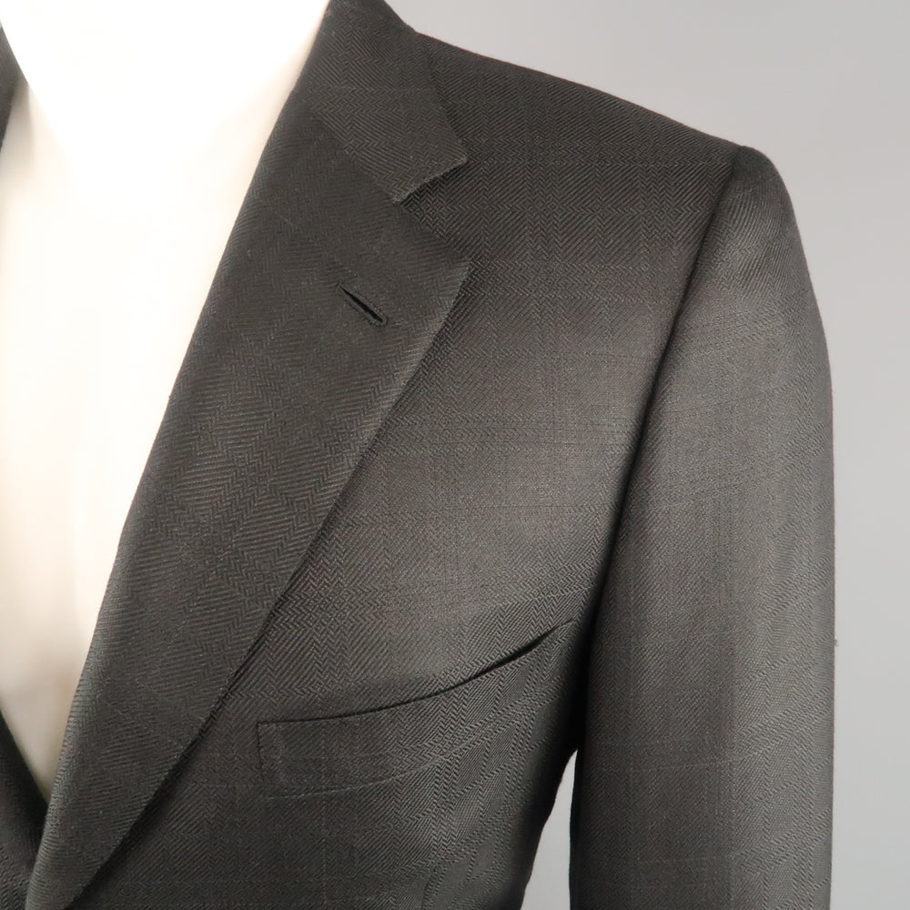 Vintage BRIONI sport coat comes in wool silk blend windowpane fabric with a notch lapel, single breasted, three button front, and functional button cuffs. Made in Italy.