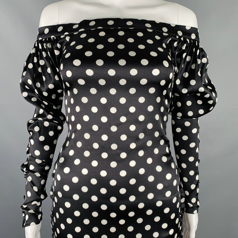 CAROLINE CONSTAS dress in a black and white silk stretch blend fabric featuring a polka dot pattern, off shoulder style, buttoned cuffs and sides, and invisible side zipper closure. Made in USA.