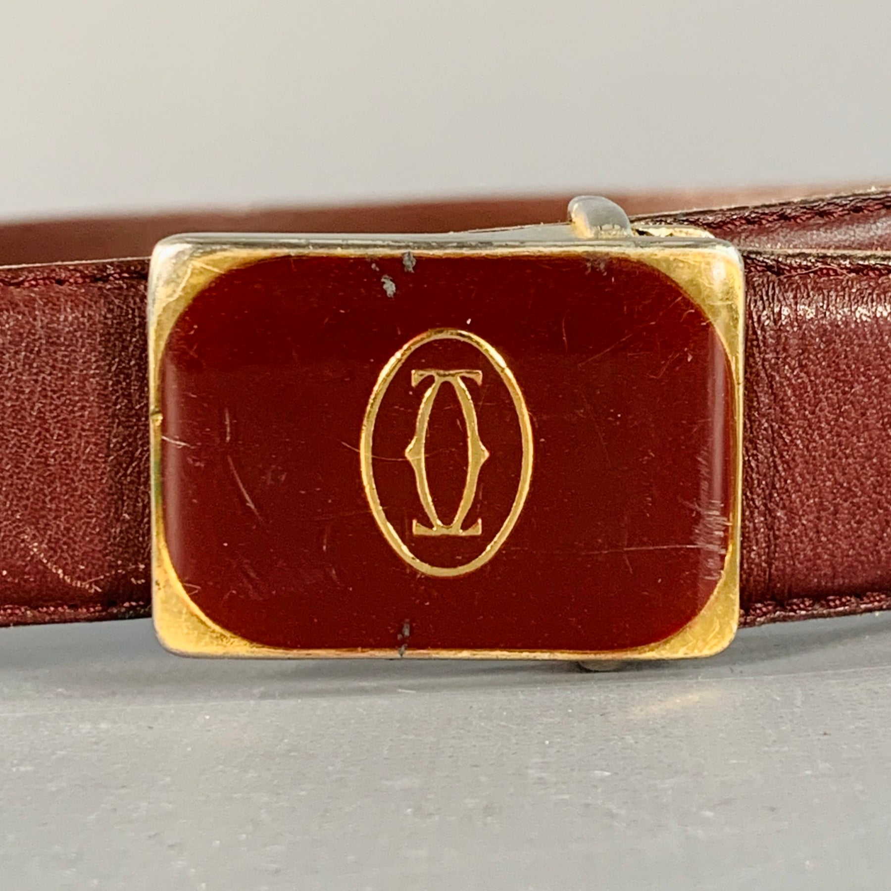 Vintage CARTIER belt in a burgundy leather featuring a tonal buckle with gold tone logo.