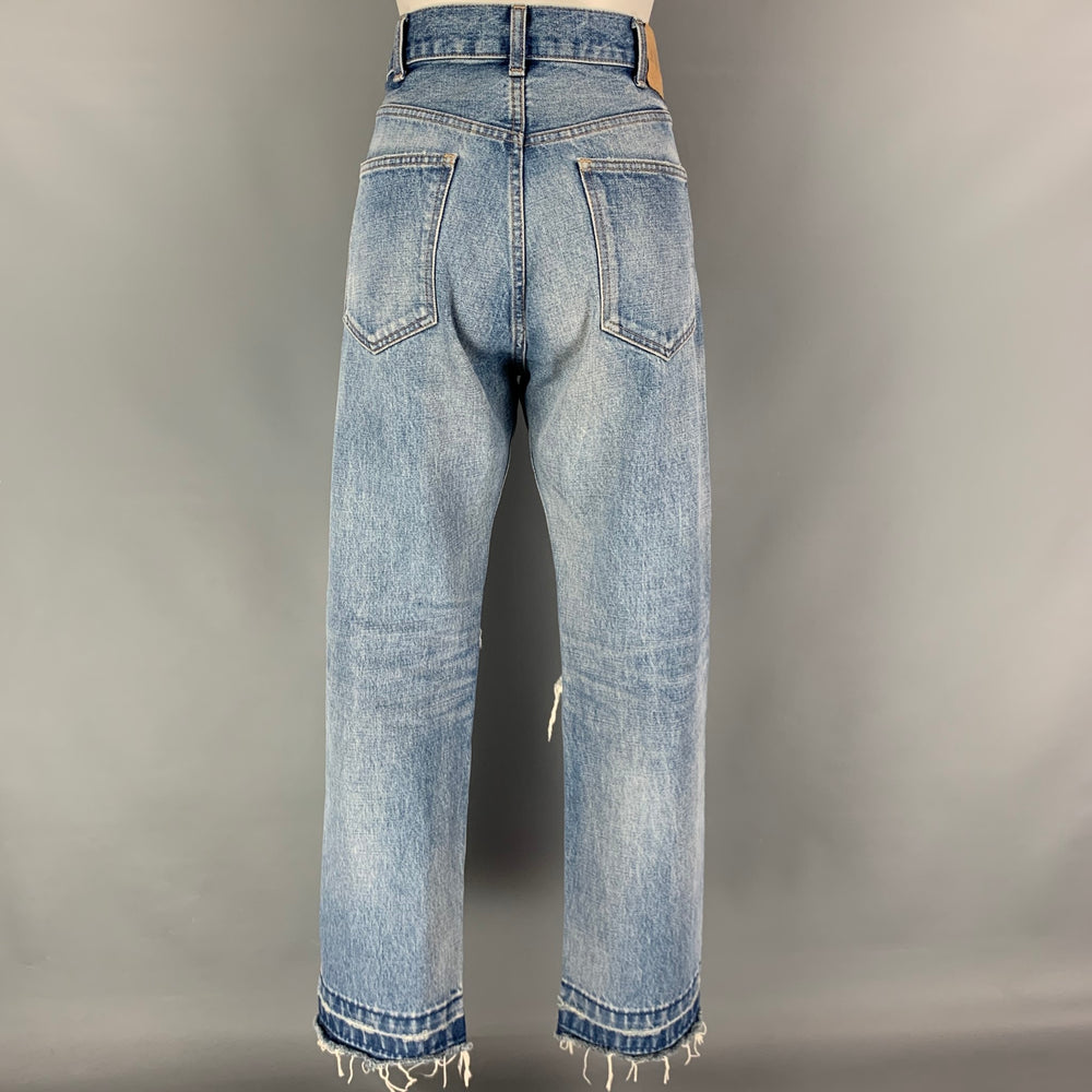 CELINE "Wesley Released Hem" jeans comes in a blue washed cotton featuring a loose fit, distressed details, contrast stitching, and a button fly closure. Made in Japan.