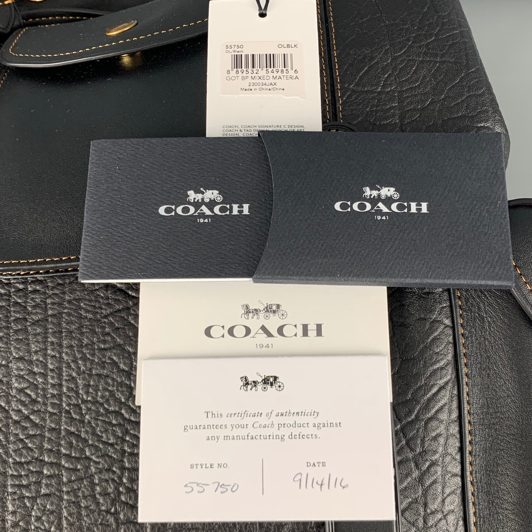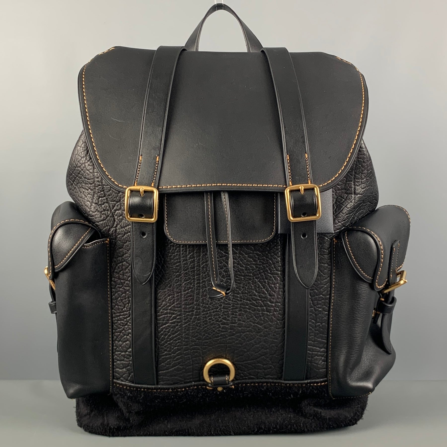 COACH Gotham backpack comes in a black calf leather and black suede leather at bottom featuring gold tone hardware, cell phone and multi function pockets, inside laptop sleeve, adjustable back strap, drawstring and snap button closures. Comes with Dust Bag.