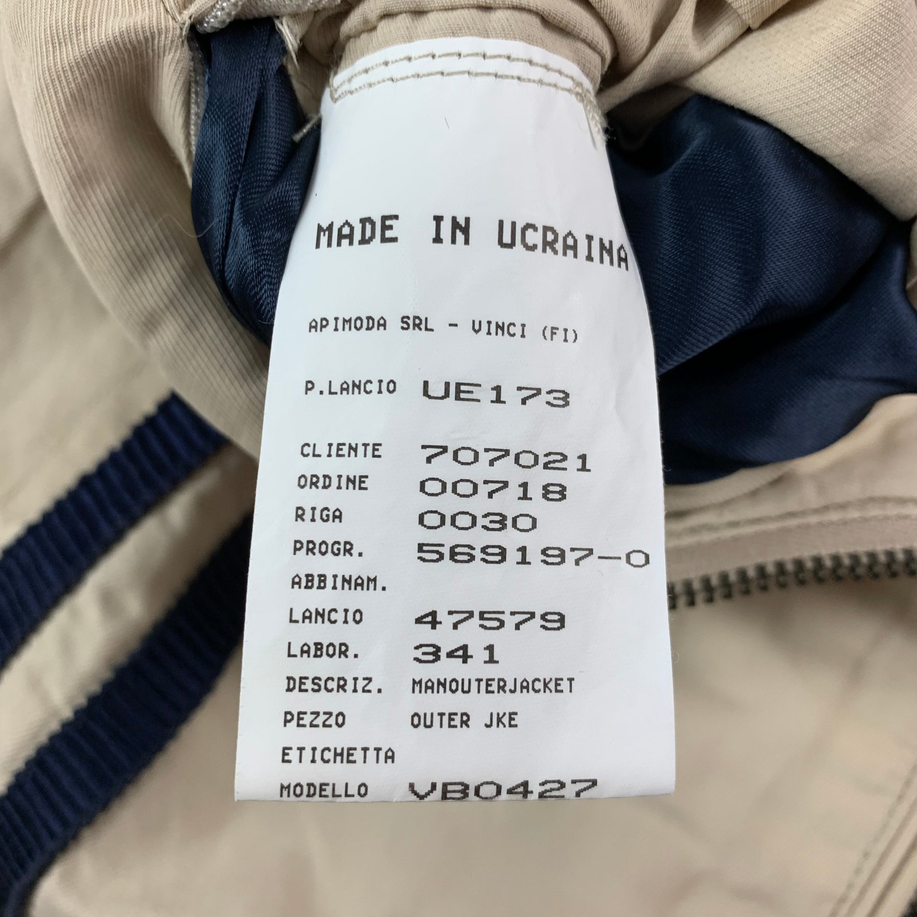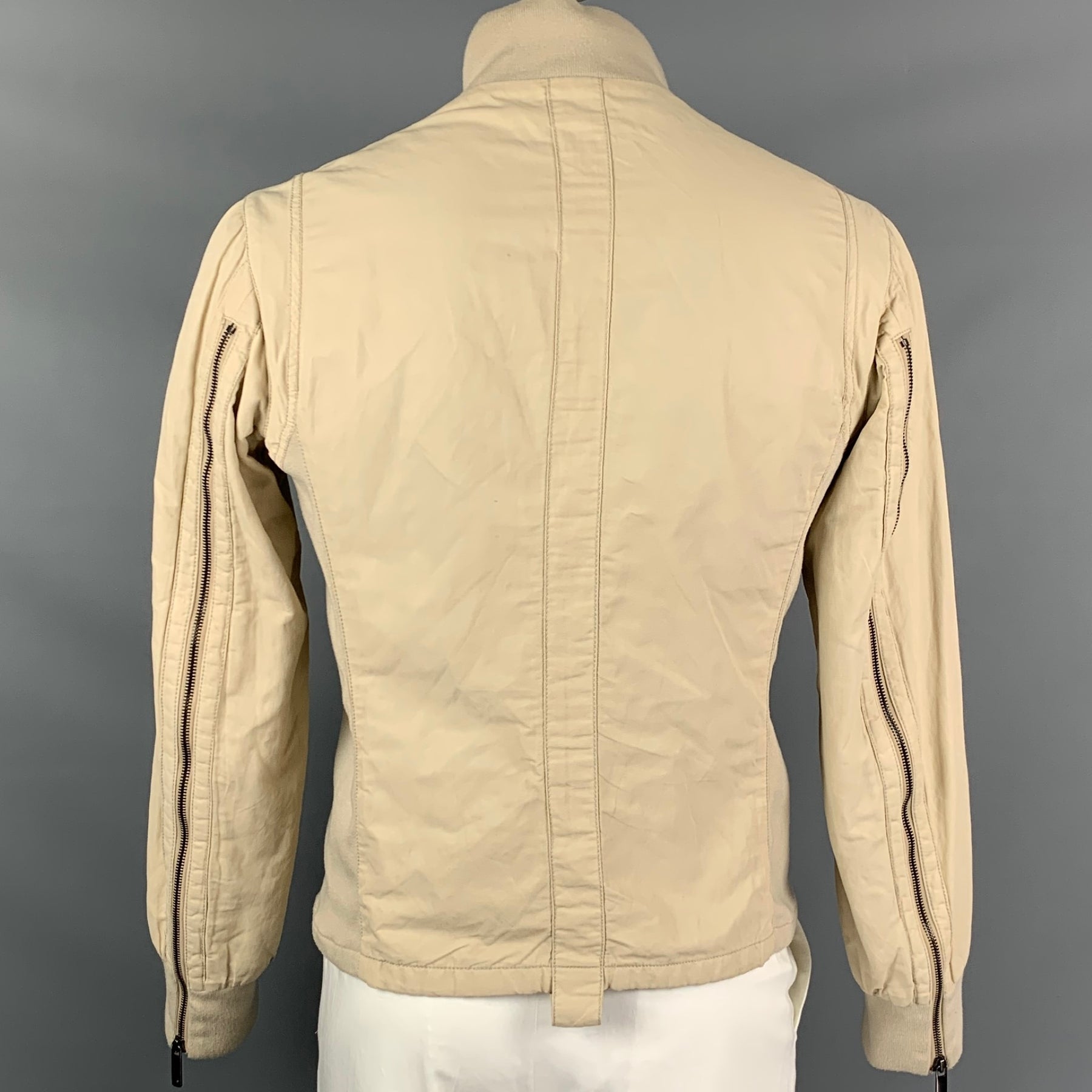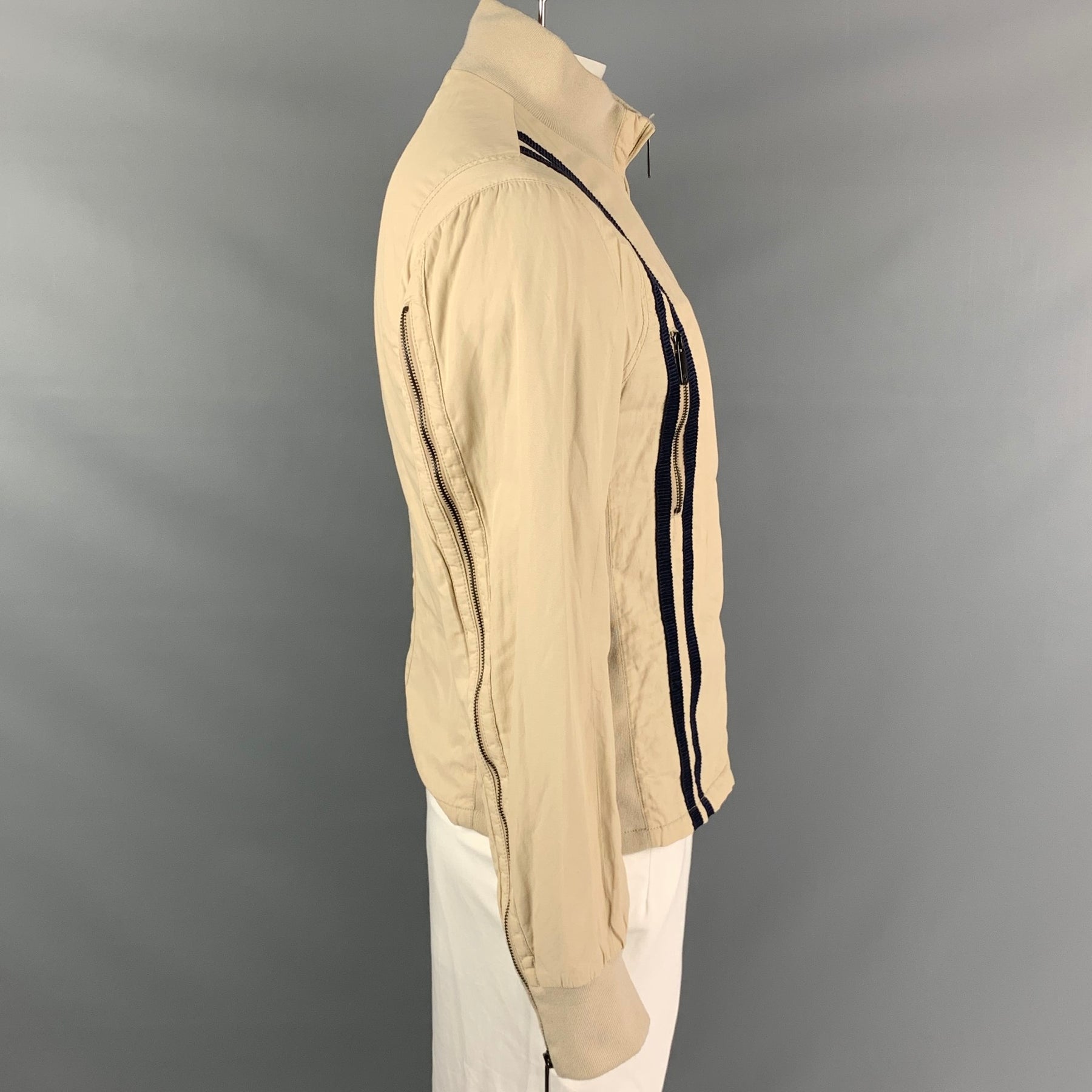 EMPORIO ARMANI jacket comes in a khaki cotton with a full liner featuring a navy trim, zipper details, high collar, front pockets, and a full zip up closure.