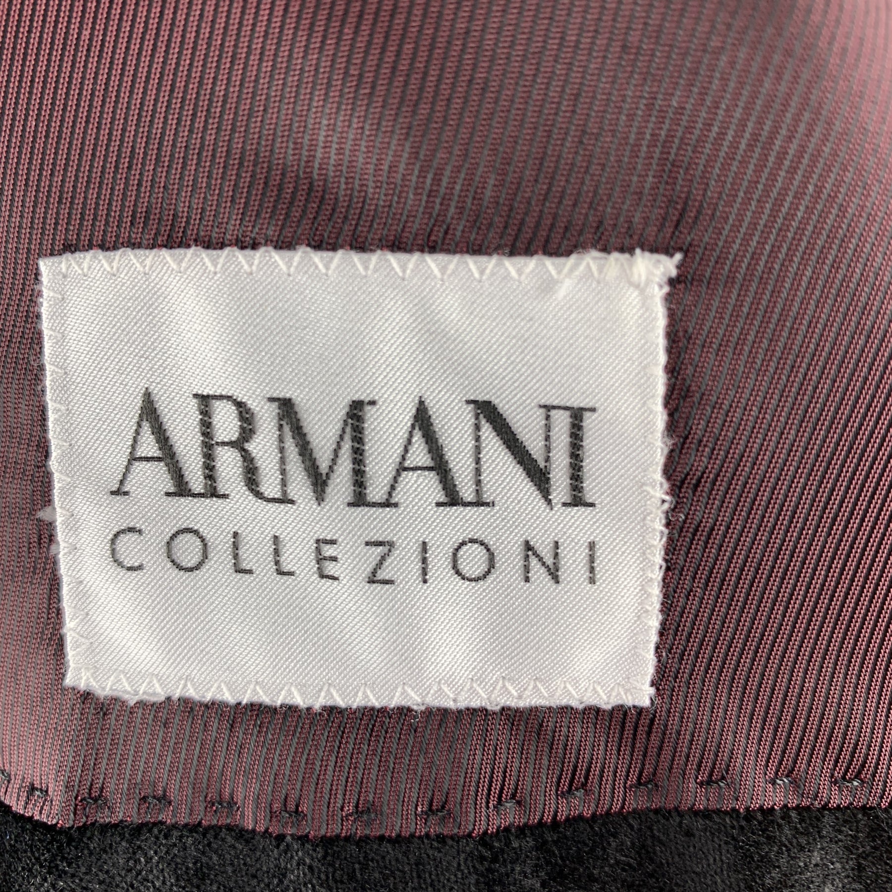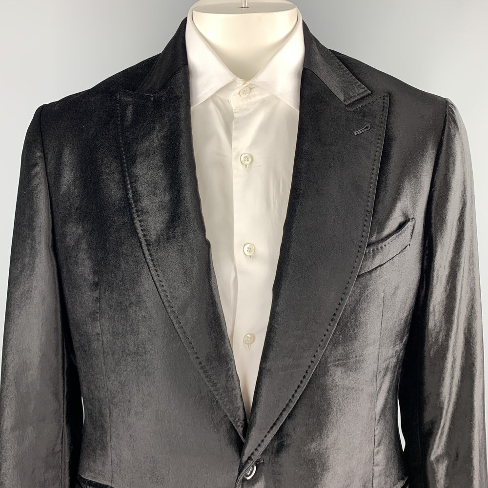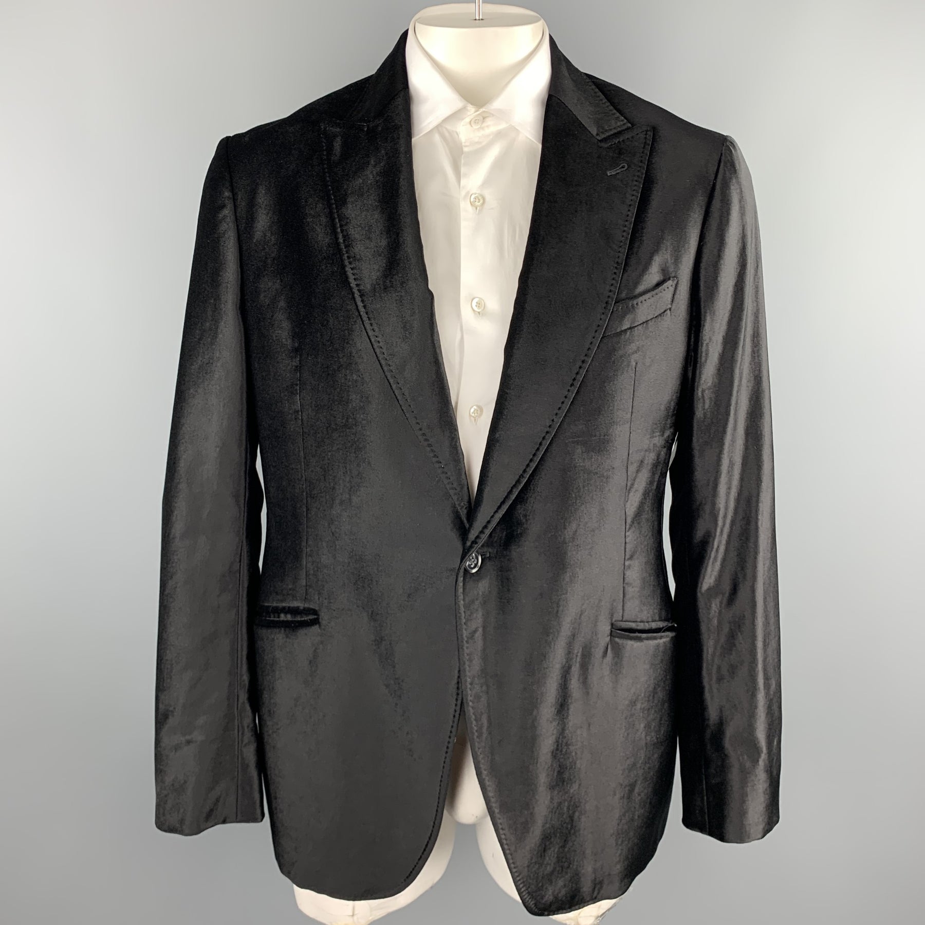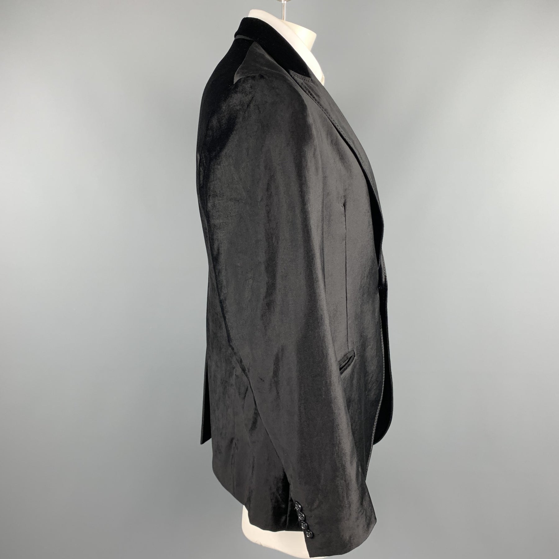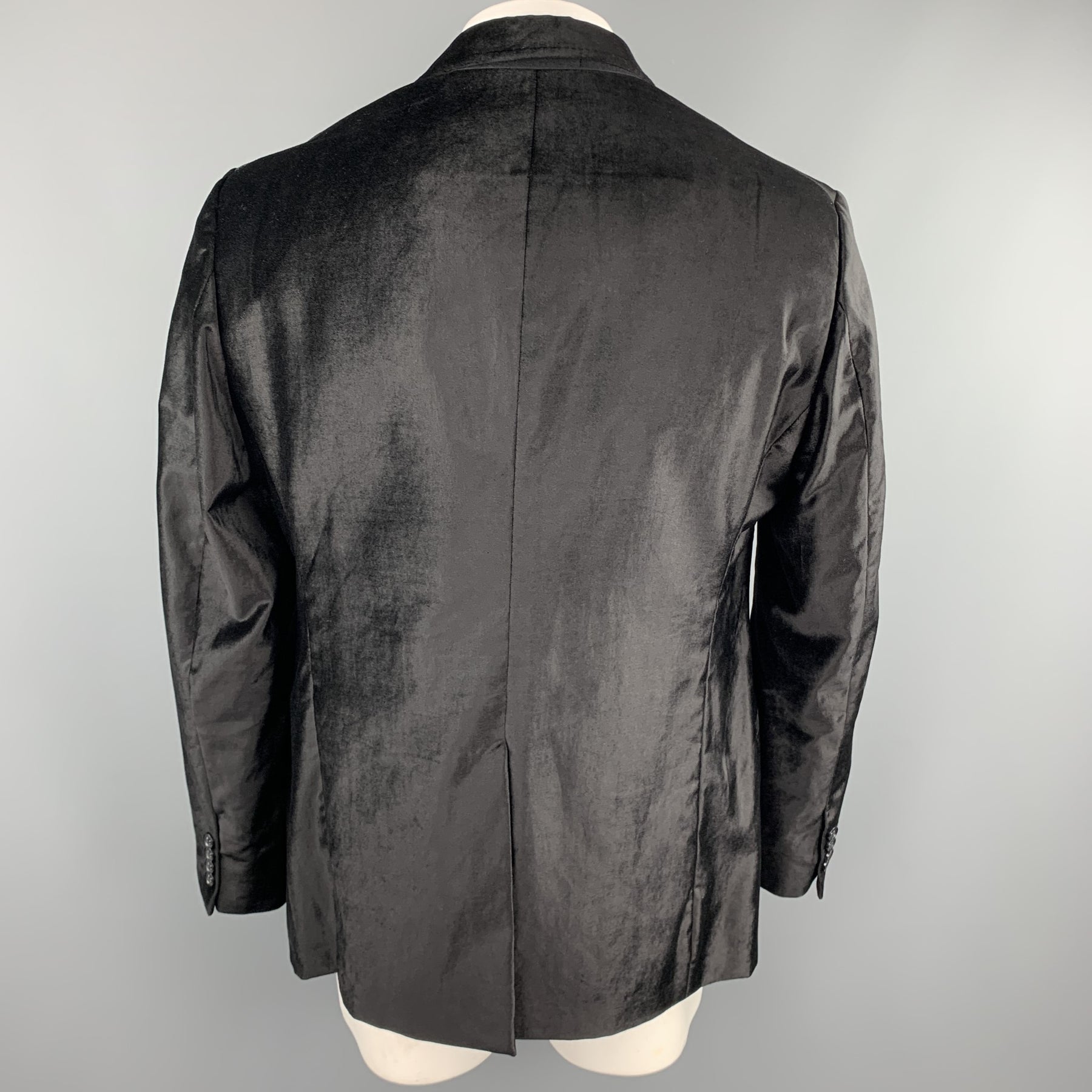EMPORIO ARMANI sport coat comes in black velvet with a peak lapel, single breasted, one button front, and top stitching throughout. Made in Portugal.